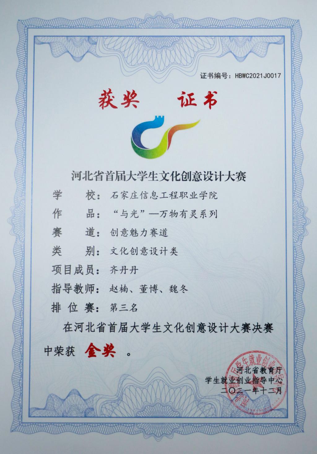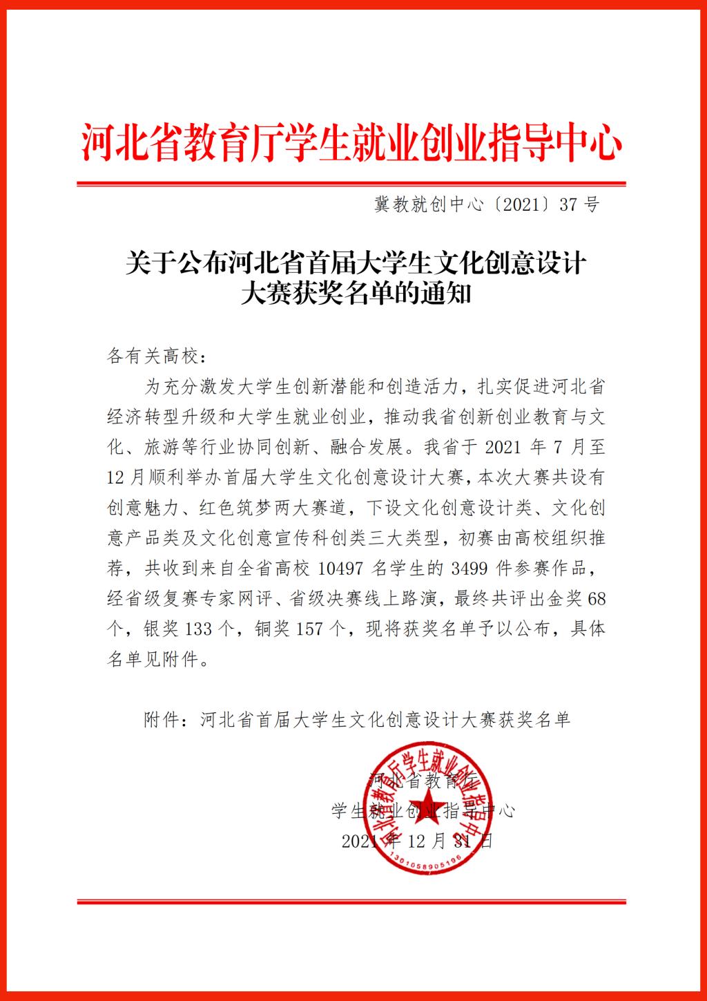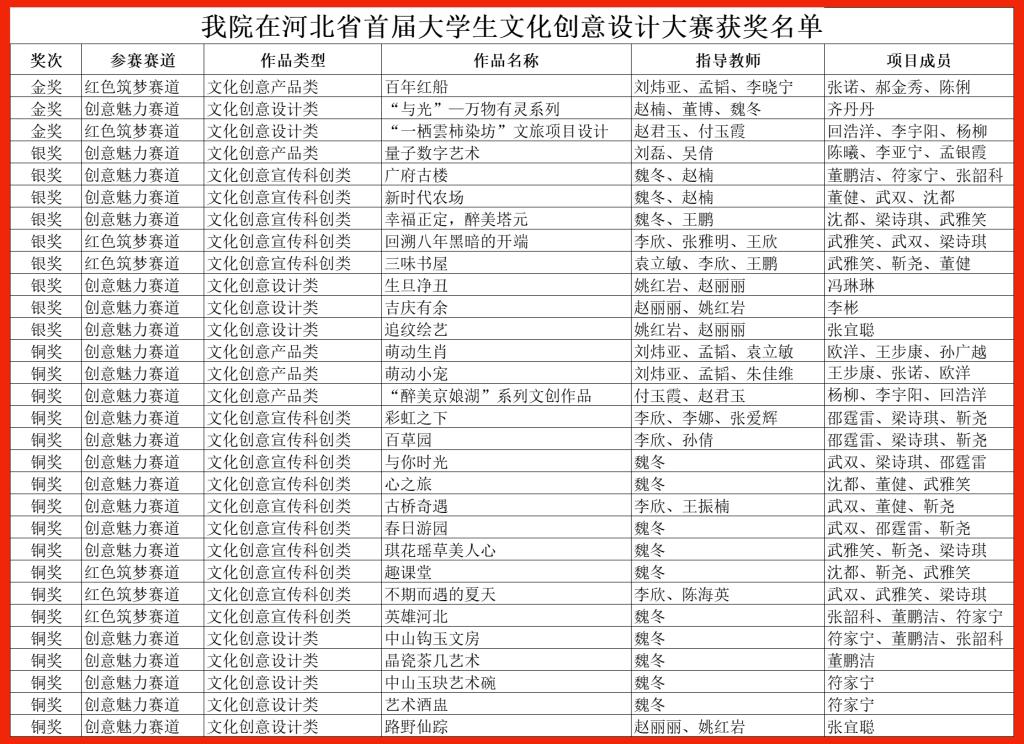 日前,由河北省教育厅主办的河北省首届大学生文化创意设计大赛获奖作品揭晓,YABO鸭脖官网选送的30个项目凭借出色的创意设计喜获3金9银18铜的佳绩。同时,YABO鸭脖官网荣获“最佳组织奖”。