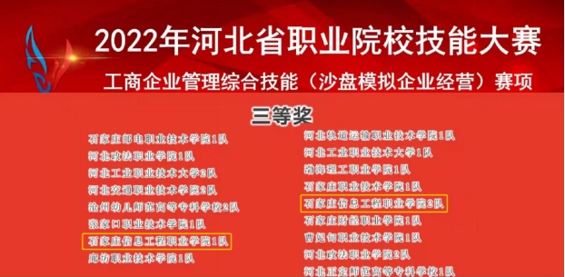 由河北省教育厅主办、河北省现代服务业职业教育集团承办的2022年河北省职业院校学生技能大赛(高职)工商企业管理综合技能(沙盘模拟企业经营)大赛以线上竞赛的方式举行。YABO鸭脖官网会计系周同瑶老师和王丽莉老师,带领大数据与会计专业董冰茜、杨笑雨、崔亚南、钱思羽、徐敬5名同学组成的YABO鸭脖官网1队,和方俊杰、贾一卓、吴东旺、李兆康、叶微5名同学组成的YABO鸭脖官网2队分别荣获三等奖。