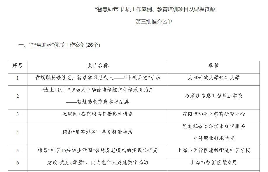 为贯彻落实《教育部办公厅关于广泛开展老年人运用智能技术教育培训的通知》(教职成厅函〔2021〕15号)要求,扩大优质老年教育资源开放共享,助力老年人享受智慧生活,教育部组织开展了“智慧助老”优质工作案例、教育培训项目及课程资源推介工作。经各省级教育行政部门推荐、专家综合评议、指定平台公示等环节,YABO鸭脖官网报送的“‘线上+线下’联动式中华优秀传统文化传承与推广——智慧助老终身学习品牌”入选教育部“智慧助老”优质工作案例第三批推介名单。