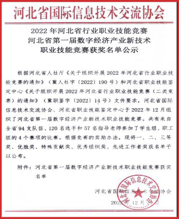 2022年河北省行业职业技能竞赛河北省第一届数字经济产业新技术职业技能竞赛,由河北省国际信息技术交流协会、河北省职业技能鉴定中心主办。全省共94支队伍、120名选手和57名指导教师参加。