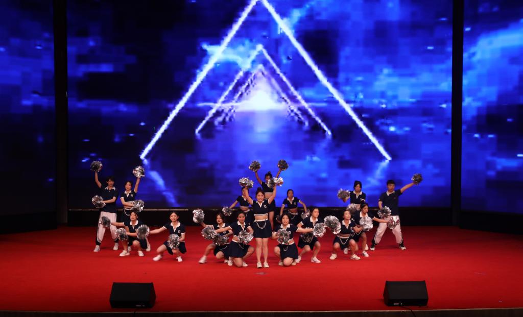 穿着靓丽服装的队员们在舞台上跟着动感的音乐,挥舞着五彩的啦啦球,动作强劲有力,整齐划一,活力四射,充满激情,充分展现了当代大学生健康向上、青春洋溢的精神风貌,为观众呈现了一场充满动感与活力的视觉盛宴。