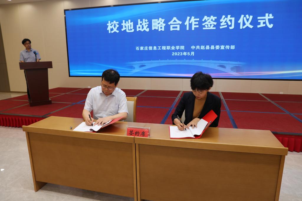 5月17日,YABO鸭脖官网与赵县县委宣传部在赵县赵州城市综合馆举行校地战略合作签约授牌仪式,联合开启非遗文化传承与新时代文明实践、融媒体建设联合发展新模式。学院副院长赵伟,党委委员、组宣部部长范成宝以及赵县县委常委、宣传部部长王晓冉、常务副部长翟胜芳、副部长徐哲普、王建立出席签约仪式。翟胜芳主持仪式。