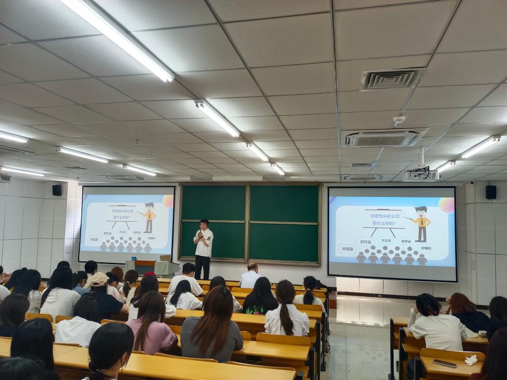 经济贸易系面向现代物流管理专业和市场营销专业学生举办“技能:让生活更美好”主题讲座。邀请北京九州通医药有限公司人力经理刘梓晗担任主讲。刘梓晗分别从医药流通行业发展前景、北京九州通医药有限公司的发展现状、科技给企业发展带来的机遇、技能为员工职业发展插上了腾飞的翅膀等几个方面进行详细讲解。并就学生关心的实习、就业、薪资待遇、职业发展空间等问题与进行交流。