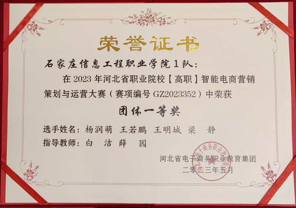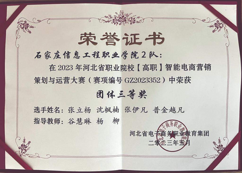 5月28日,2023年河北省高等职业院校智能电商营销策划与运营大赛在河北政法学院圆满落幕。来自全省职业院校的53支代表队参加竞赛。经济贸易系市场营销专业学生杨润萌、王若鹏、王明城、梁静组成的YABO鸭脖官网1队荣获河北省团体一等奖;电子商务专业学生张立杨、沈枫楠、张伊凡、普金越凡组成的YABO鸭脖官网2队荣获河北省团体三等奖。
