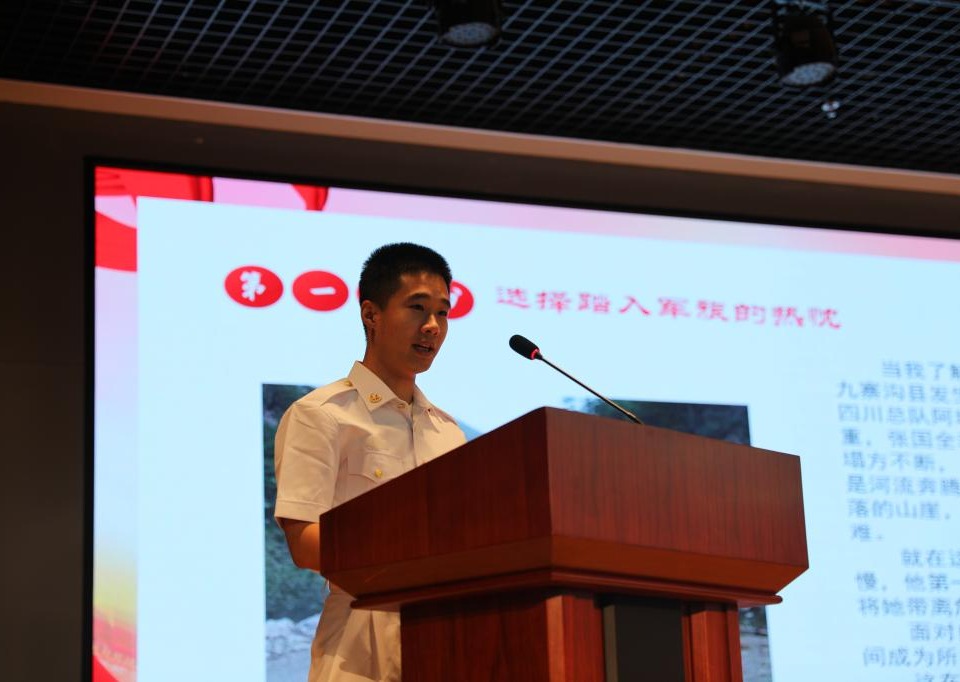 “我曾是北海舰队驱逐舰第十支队的一名战士,在服役期间跟随舰艇走过了全国的海岸线。经历了当时最新型号导弹的试射、北海神鹰军演、南海猎鲨行动……”刘坤锋同学的讲述吸引了在场的同学们。