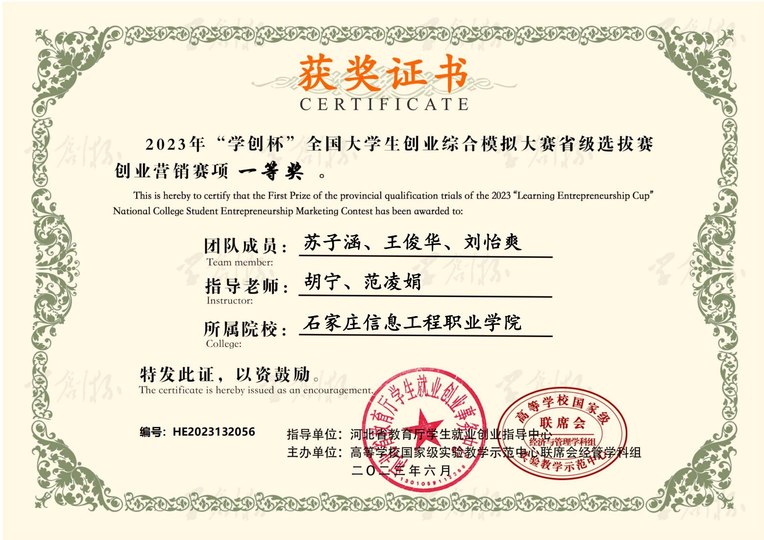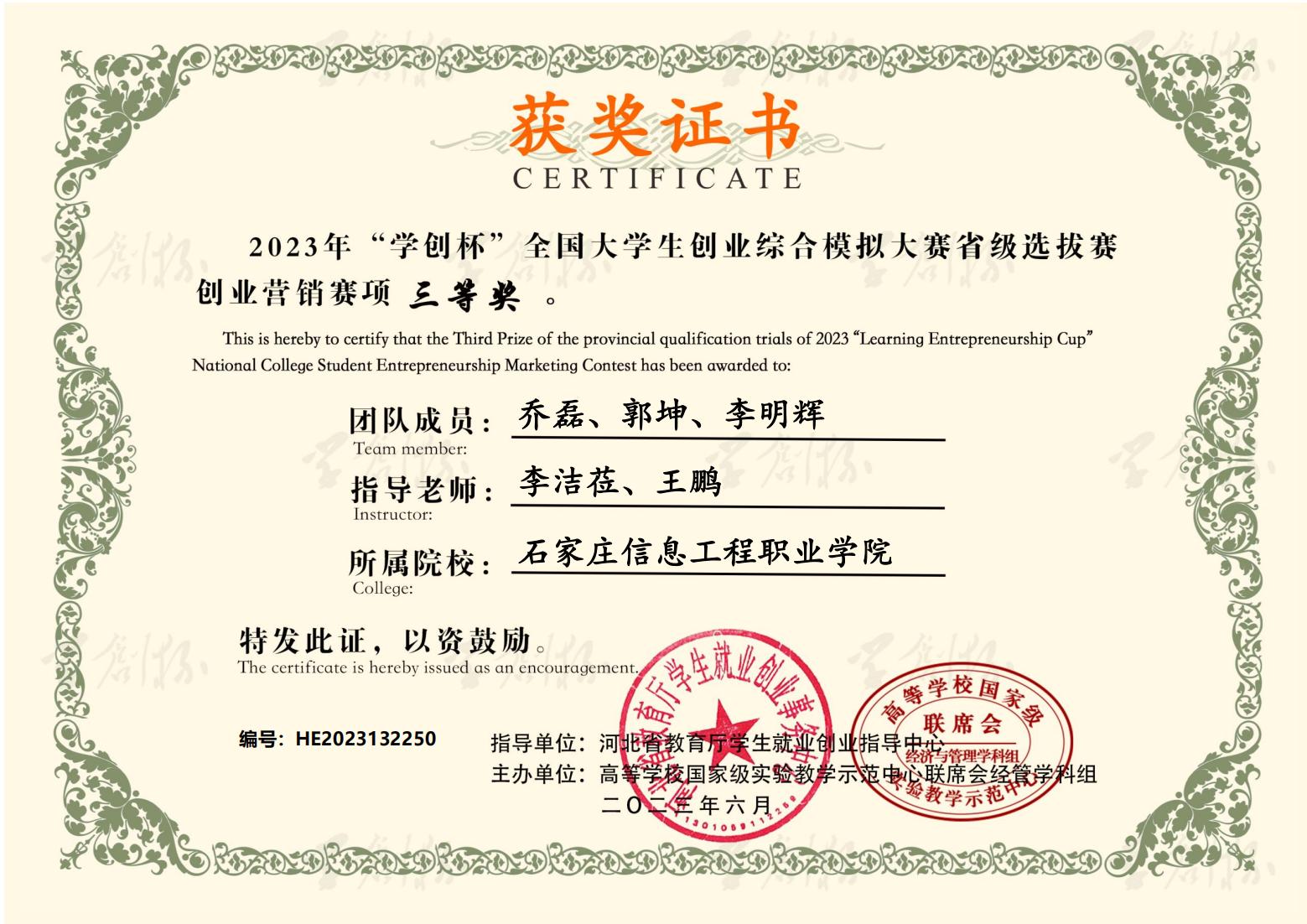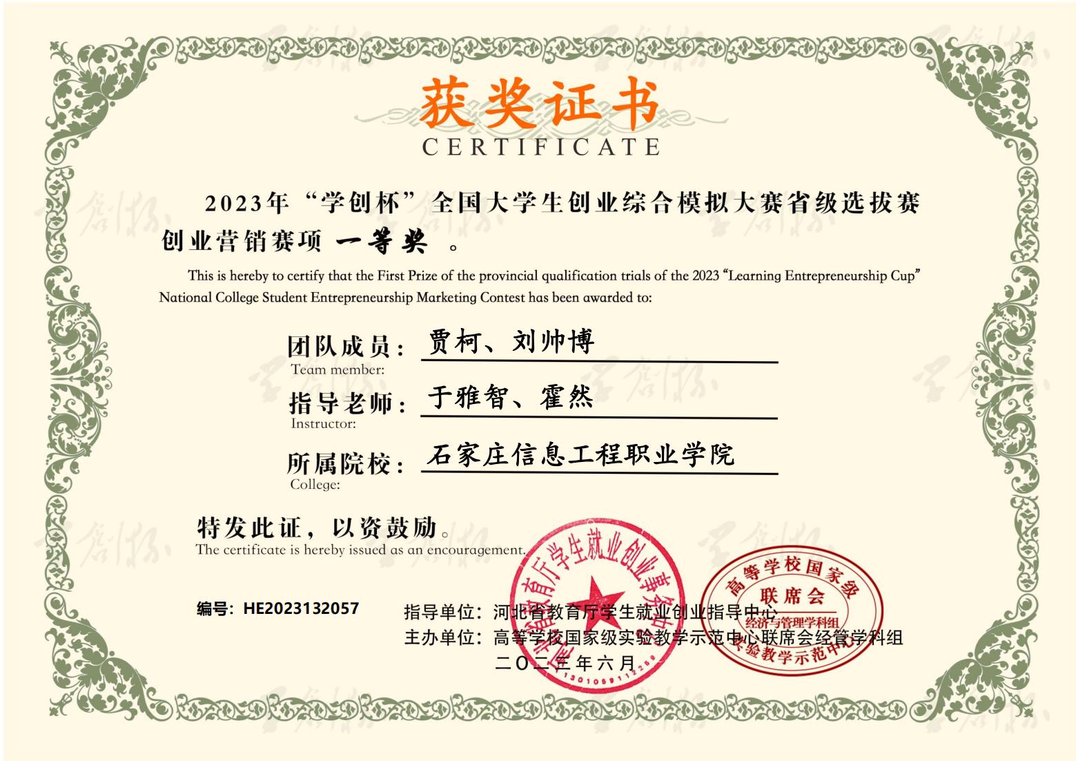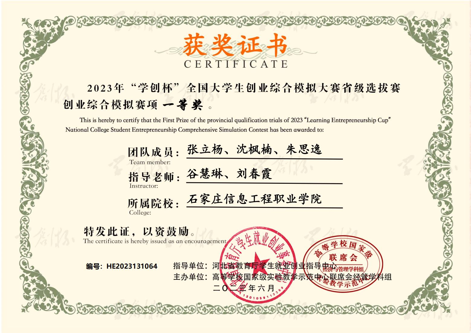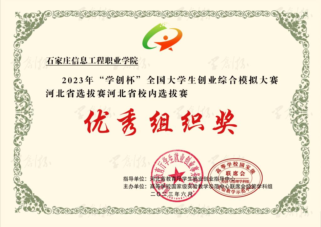 近日,2023年“学创杯”全国大学生创业综合模拟大赛河北省选拔赛圆满落幕。大赛启动以来,YABO鸭脖官网积极响应,精心组织,经过校内选拔赛和省赛的激烈角逐,六支参赛队伍共获得一等奖3个,二等奖1个,三等奖2个。同时,获得一等奖的团队指导教师荣获“最佳指导教师”称号,获得二、三等奖的团队指导教师荣获“优秀指导教师”称号。YABO鸭脖官网荣获优秀组织奖。