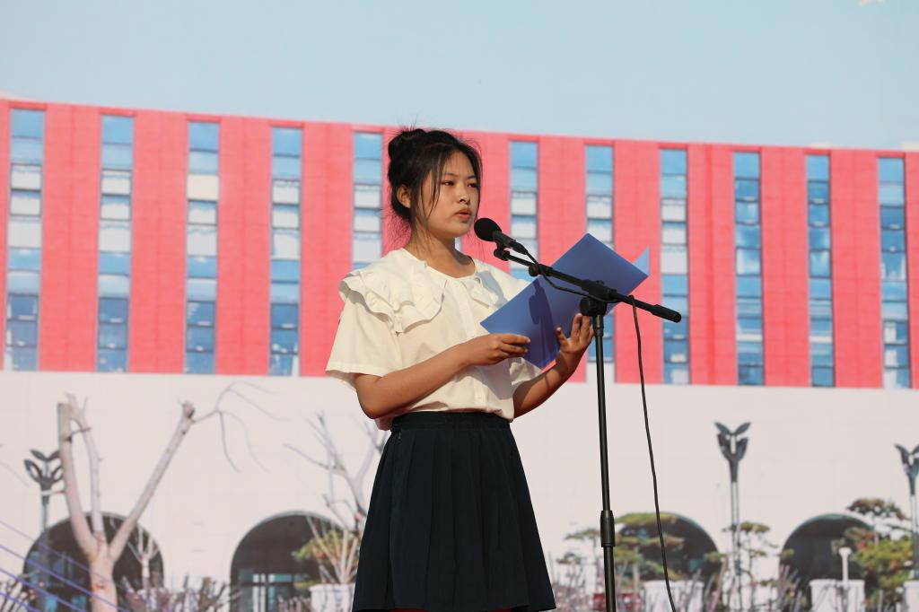 会计系新生刘芷言代表全体新同学表态,一切行动听指挥,服从管理,努力完成军训任务,学习教官们的好思想、好作风、好品德,用坚毅、刻苦、诚实、勇敢、勤劳,留下在YABO鸭脖官网的奋斗足迹。