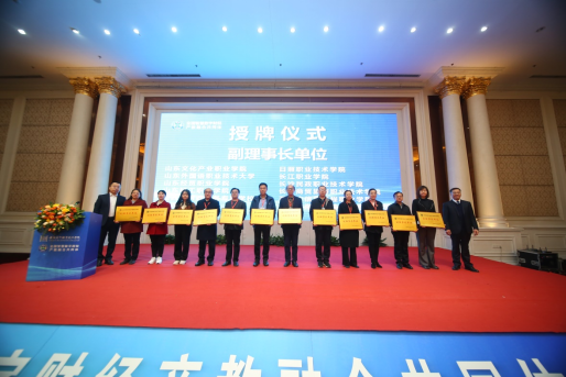 ▲图为会计系副主任姜明霞(右五)代表学院接受副理事长单位授牌