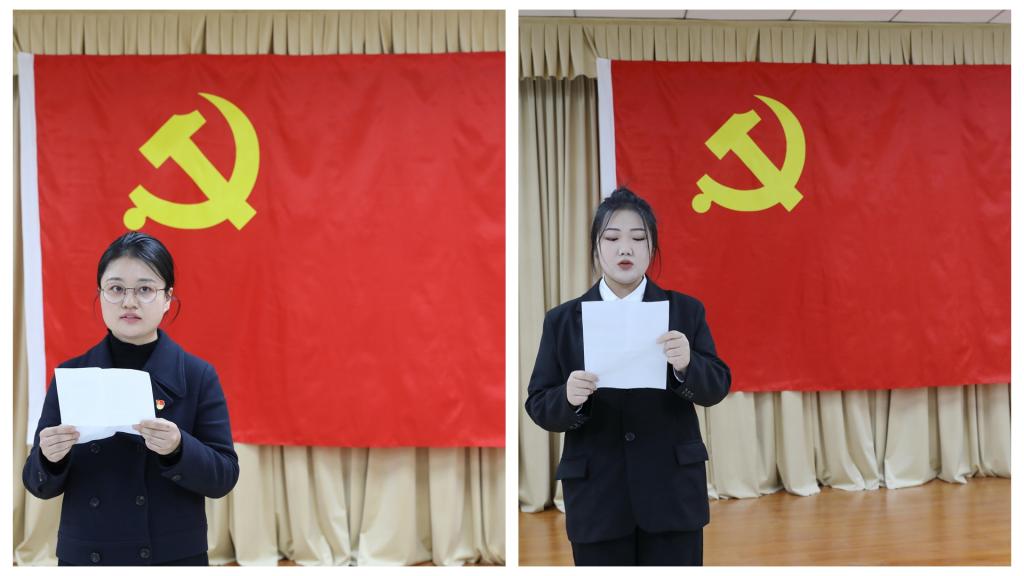 ▲教职工预备党员代表闫茹玉(左)、学生预备党员代表闫贺然(右)发言