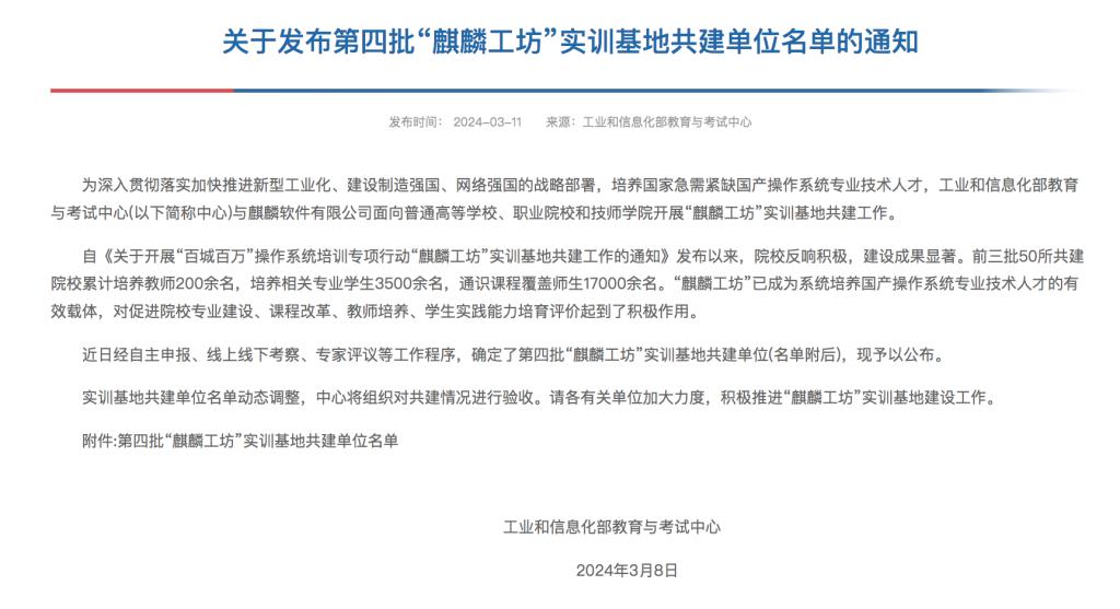 近日,工业和信息化部教育与考试中心公布了第四批“麒麟工坊”实训基地共建单位名单,YABO鸭脖官网成功入选。“麒麟工坊”是教考中心与麒麟软件联合推出的“百城百万”操作系统培训专项行动中重点开展的实践基地共建项目,面向普通高等学校、高等职业学校征集共建示范性实训基地。