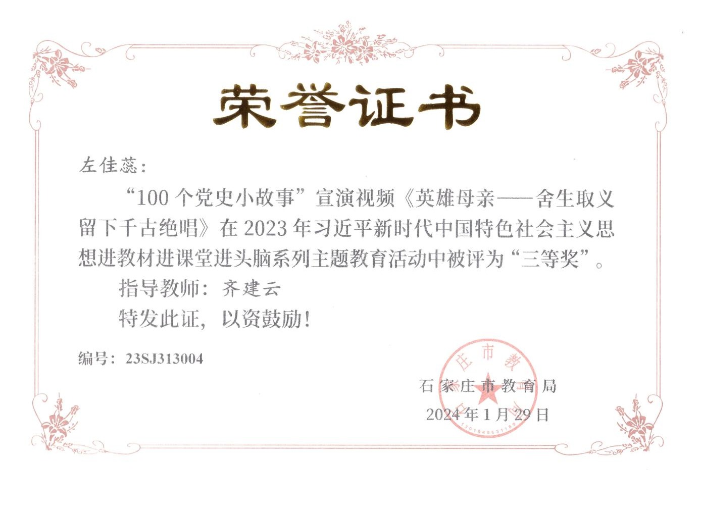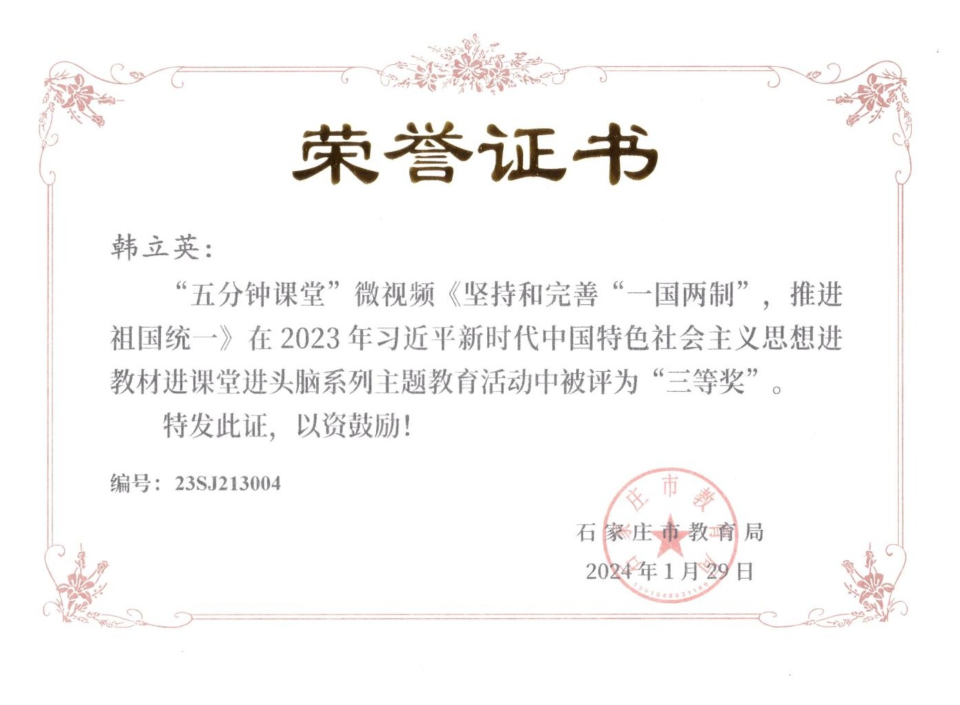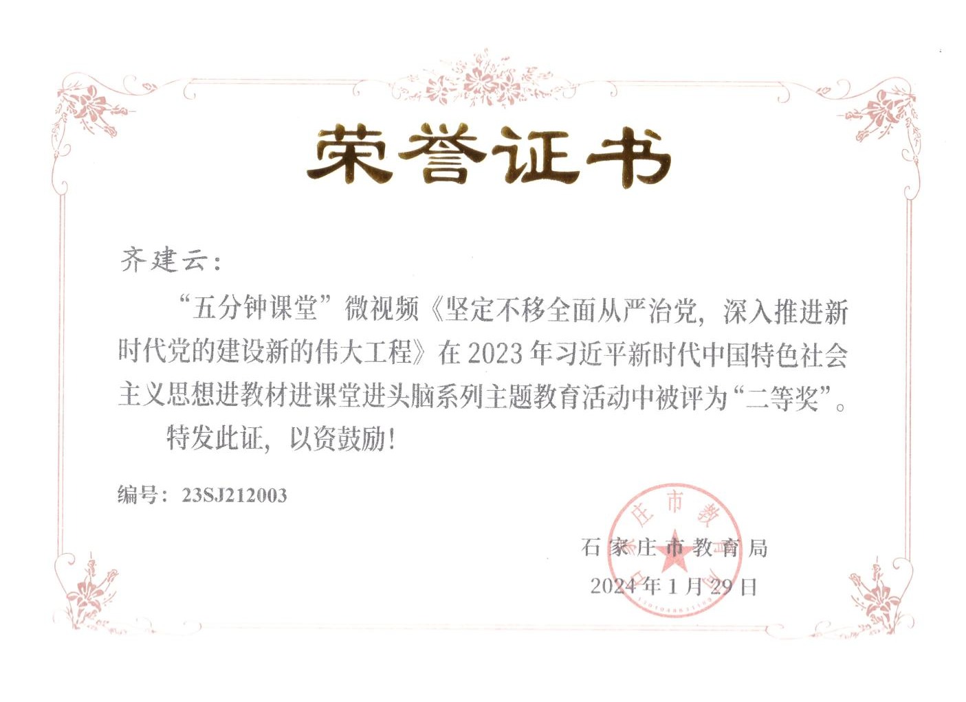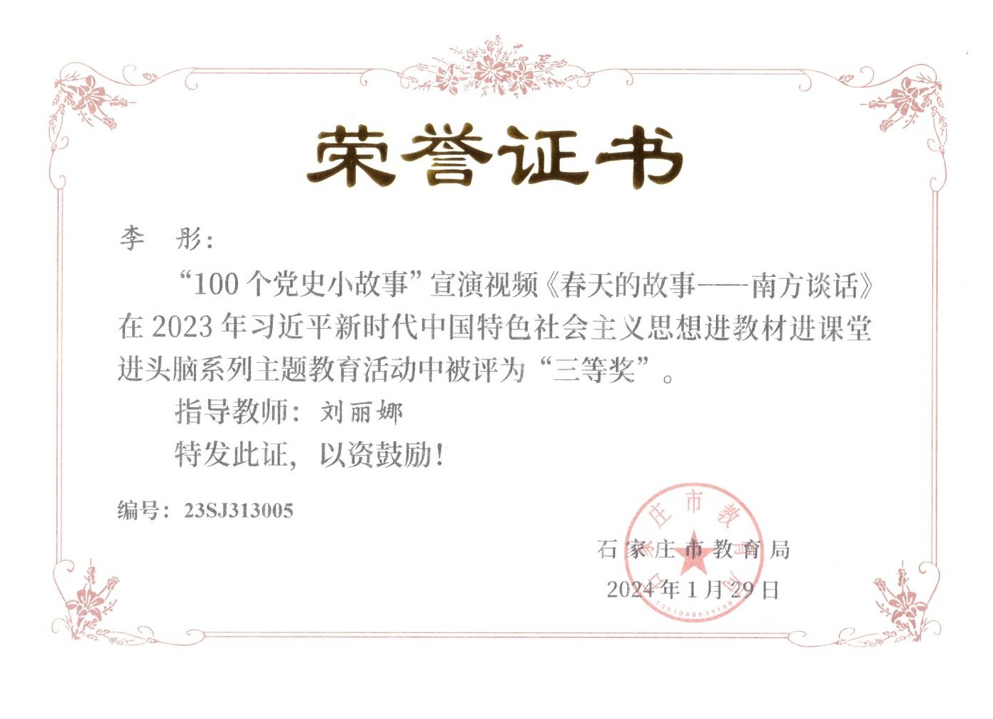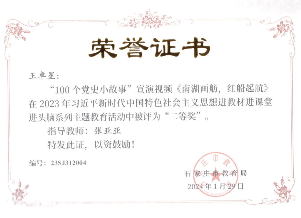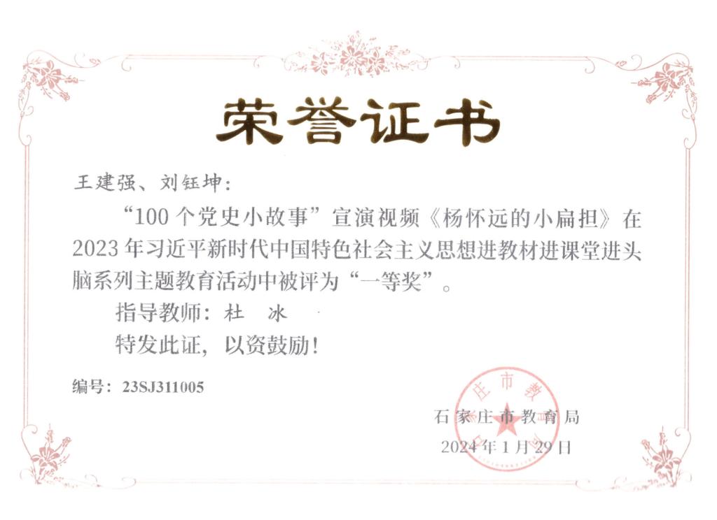 近日,由石家庄市教育局主办的“2023年习近平新时代中国特色社会主义思想进教材进课堂进头脑系列主题教育”活动落下帷幕,马克思主义学院教师在活动中荣获“五分钟课堂”微视频比赛一等奖2项、二等奖2项、三等奖2项,指导学生参与的“100个党史小故事”宣讲视频比赛7人荣获一等奖、3人荣获二等奖,4人荣获三等奖。