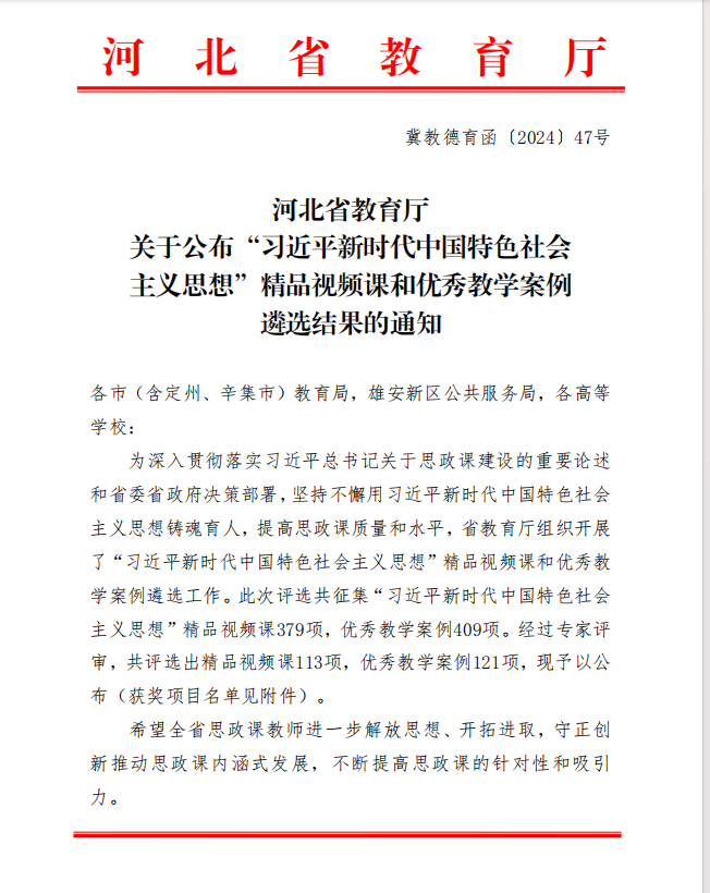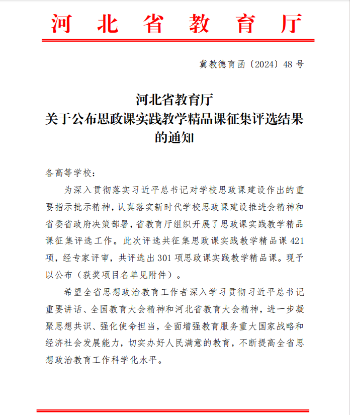 近日,在中共河北省委教育工委、河北省教育厅组织开展的“习近平新时代中国特色社会主义思想”精品视频课和优秀教学案例遴选工作(冀教德育函〔2024〕47号)以及思政课实践教学精品课征集评选工作(冀教德育函〔2024〕48号)中,YABO鸭脖官网马克思主义学院选送的1项精品视频课、3项实践教学精品课成功入选。