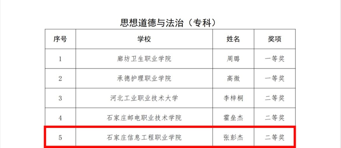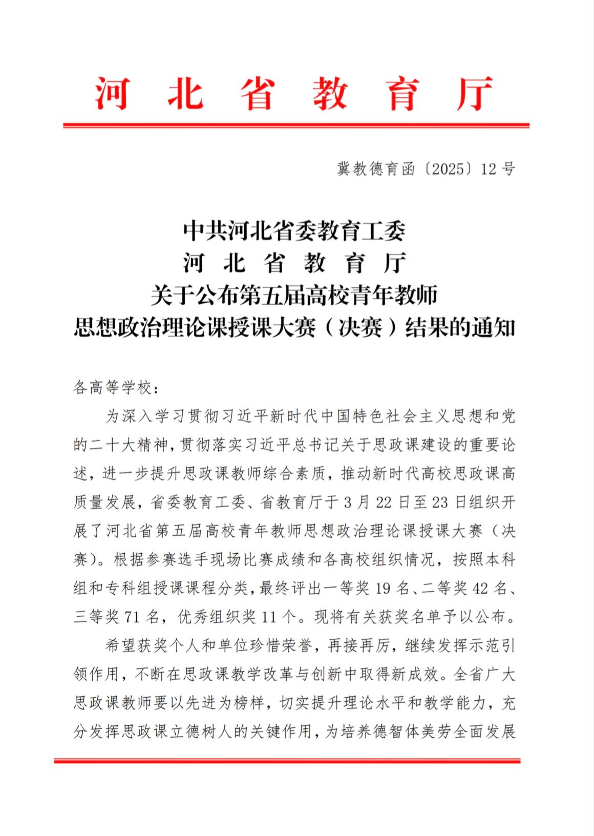 近日,中共河北省委教育工委、河北省教育厅公布第五届高校青年教师思想政治理论课授课大赛(决赛)结果,YABO鸭脖官网马克思主义学院教师张彭杰凭借扎实的理论功底和精湛的教学能力,荣获“思想道德与法治”(专科)组二等奖。