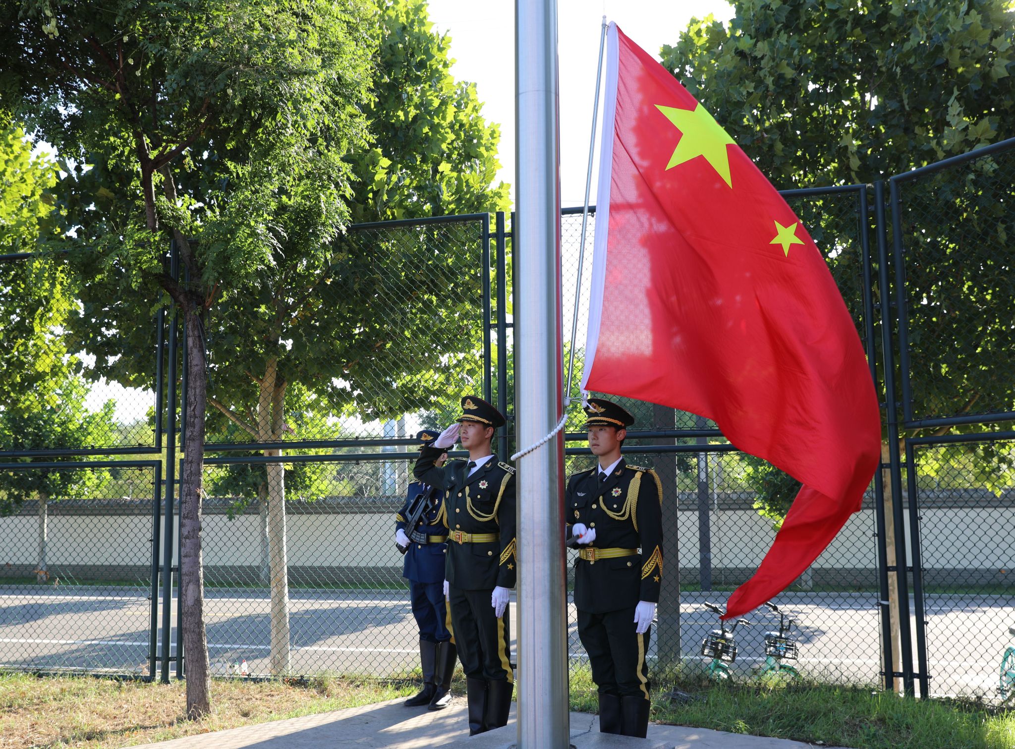 大会伊始,全体人员起立,行注目礼,在清晨朝阳中升国旗、唱国歌。
