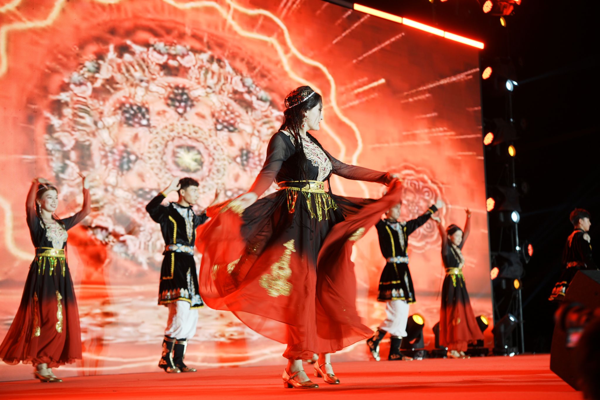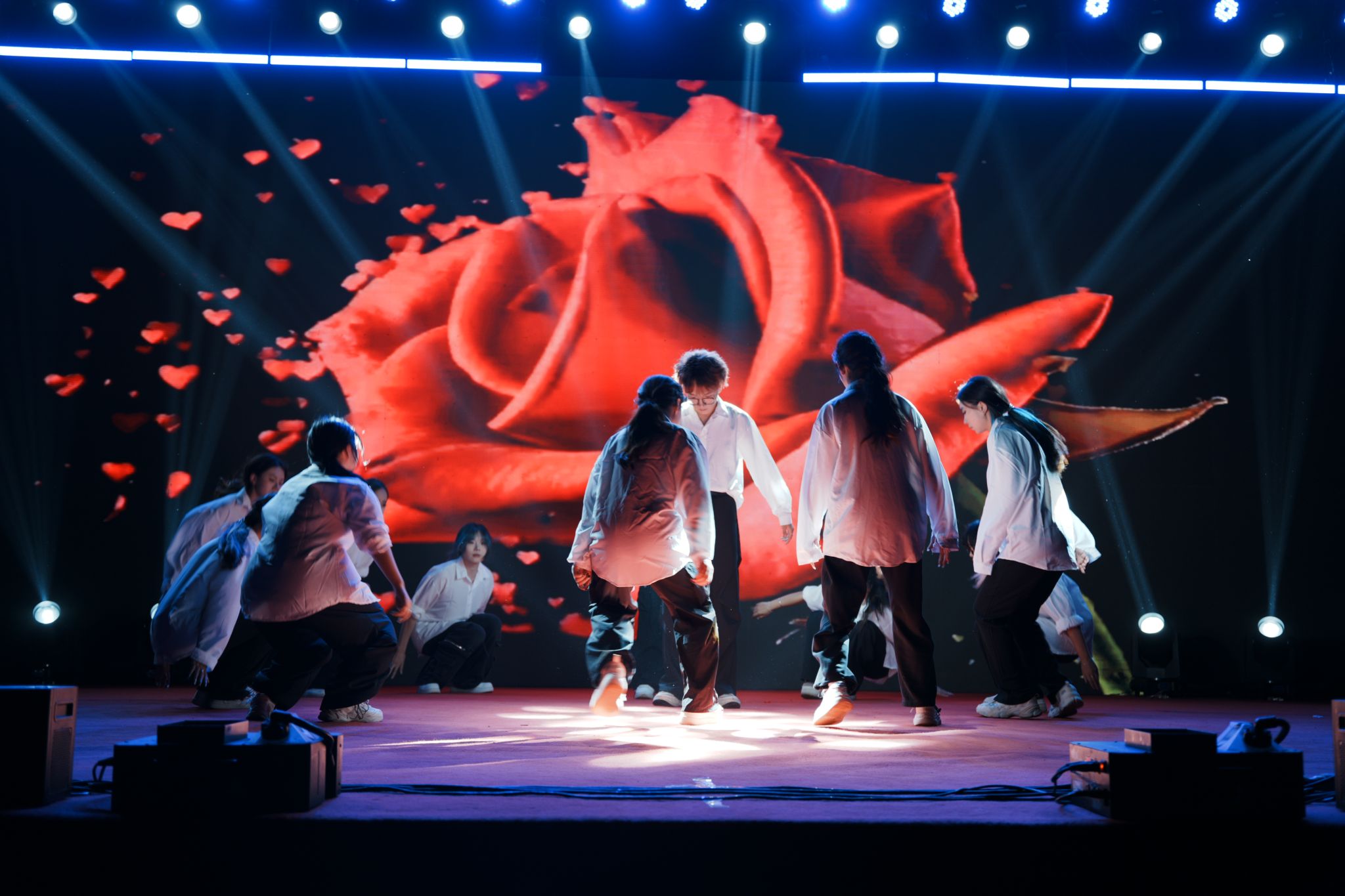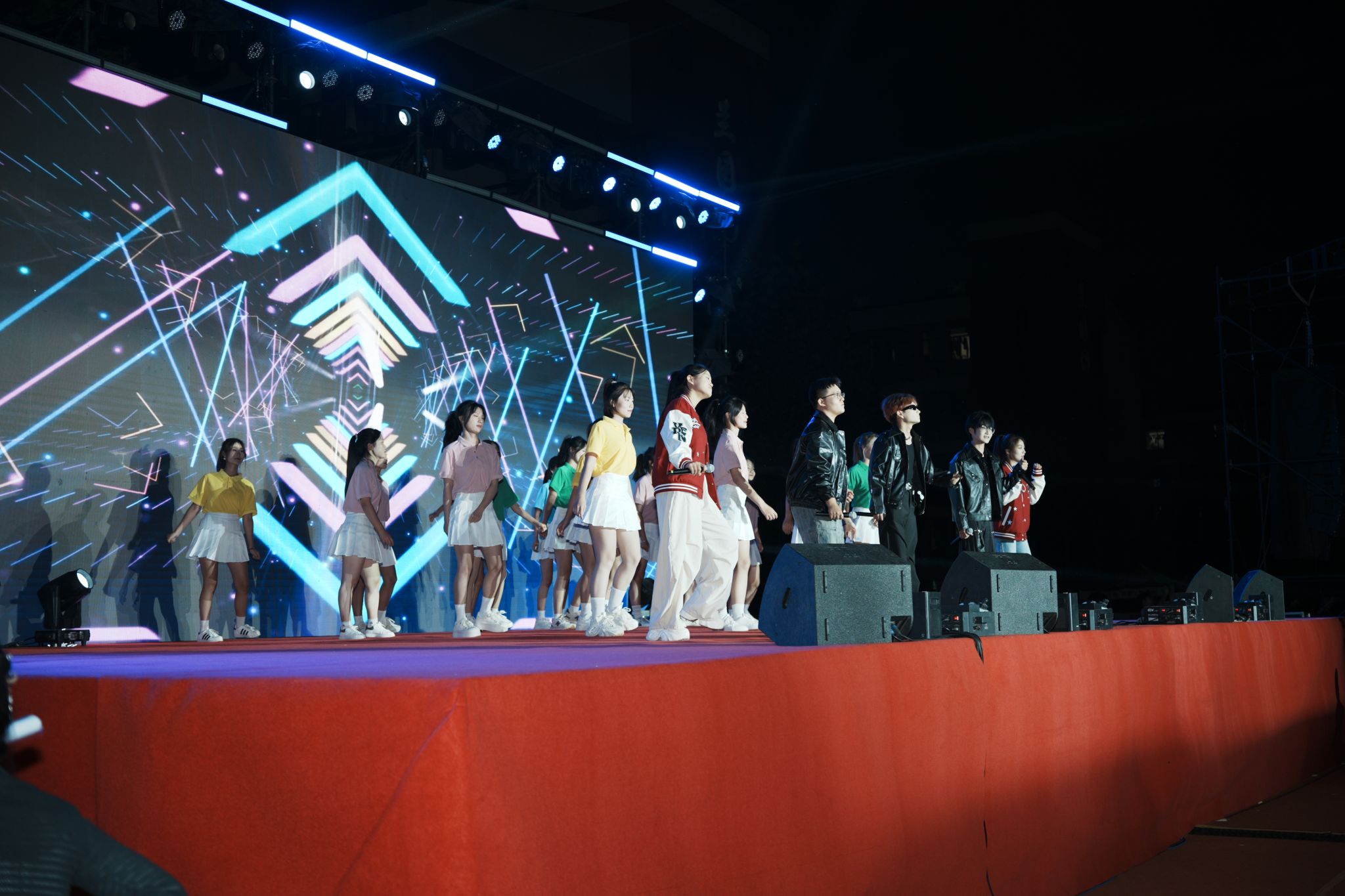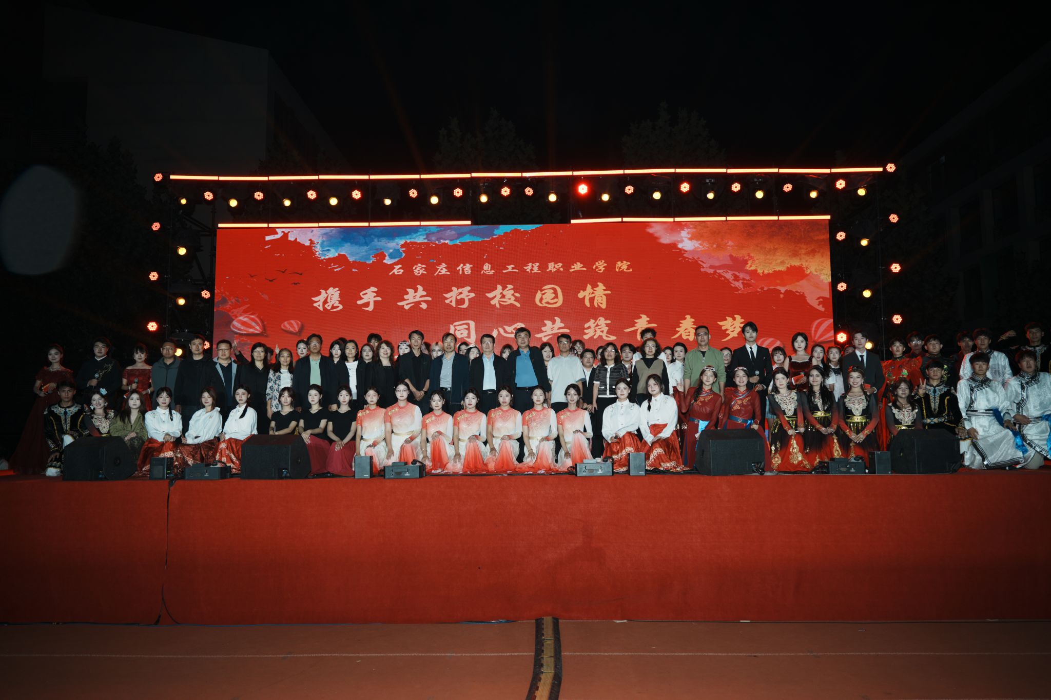 晚会在激昂的开场词中正式拉开帷幕。六位主持人以“江河奔涌,终汇于海;繁星闪烁,共聚银河”的诗意开场,寓意2025级新生如百川汇流般相聚信工学院,开启人生新篇章。整场晚会节目精彩纷呈,亮点频出。开场节目《超级英雄》以热血澎湃的表演瞬间点燃全场气氛;舞蹈《寄明月》将传统扇舞与现代编舞完美融合,展现东方美学韵味;歌伴鼓《骁》用清新旋律唱出青春心声;维吾尔族舞蹈以其独特的民族风情和欢快节奏赢得满堂喝彩。石家庄市歌舞团的歌手李志宇应邀为同学们带来了歌曲《蒙娜丽莎的眼泪》《倒数》,专业的表演和极具穿透力的嗓音让师生们叹为观止,更是将晚会推向高潮。川剧《变脸》节目惊艳全场,表演者手法娴熟,瞬息万变的创意T台秀展现了学子们的奇思妙想,他们将专业元素与时尚设计相结合,体现了信工学子的翩翩风采。歌伴舞《春天》用蒙语吟唱传递草原情怀,引发全场大合唱。晚会在歌伴舞《我爱你中国》中圆满落幕。
