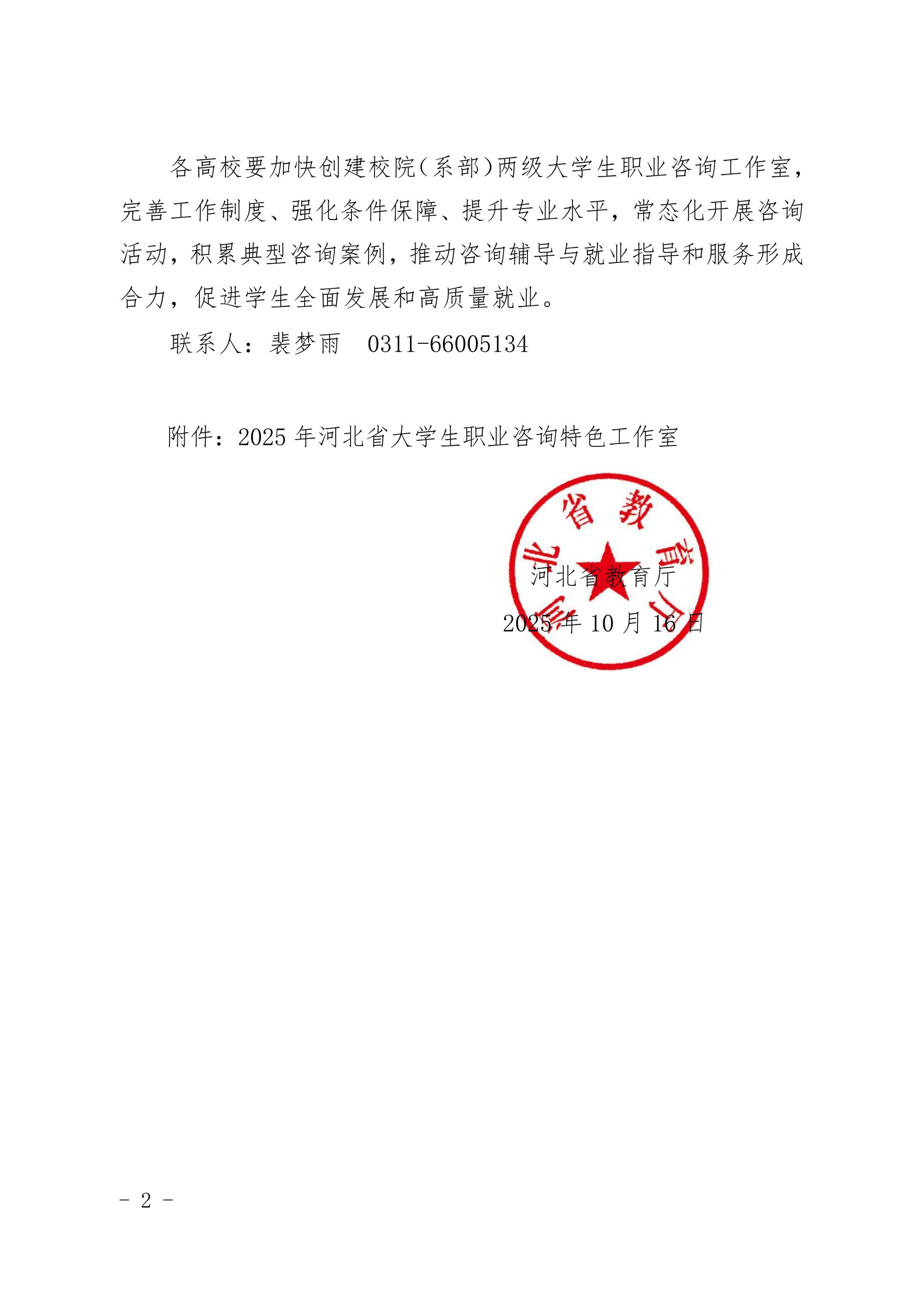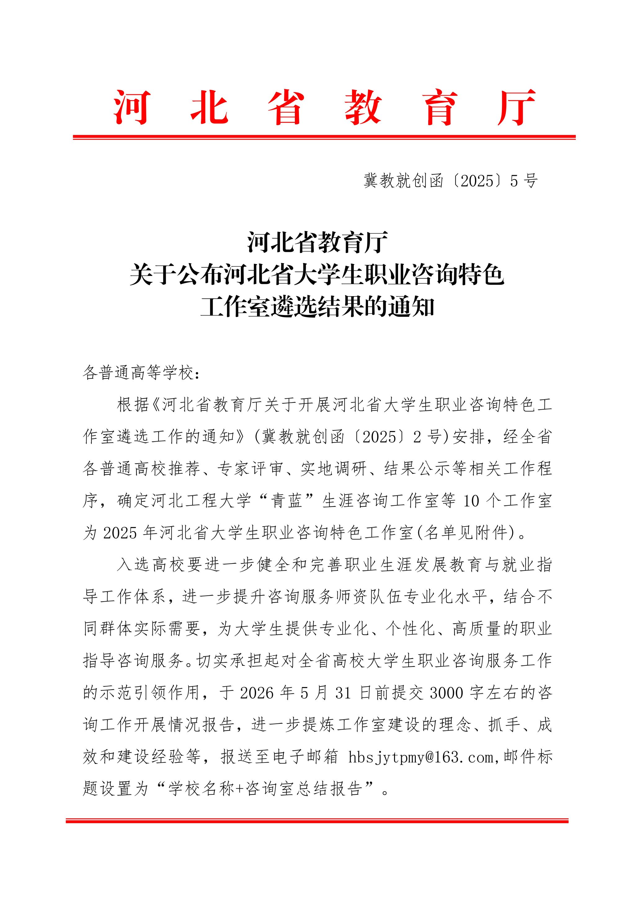 近日,河北省教育厅印发《关于公布河北省大学生职业咨询特色工作室遴选结果的通知》(冀教就创函〔2025〕2号),经高校推荐、专家评审、实地调研、结果公示等多环节严格遴选,YABO鸭脖官网“思悟”职业生涯咨询工作室成功入选,成为全省10个获此殊荣的大学生职业咨询特色工作室之一,标志着YABO鸭脖官网职业生涯教育与就业指导工作的专业化、特色化建设获得省级权威认可。
