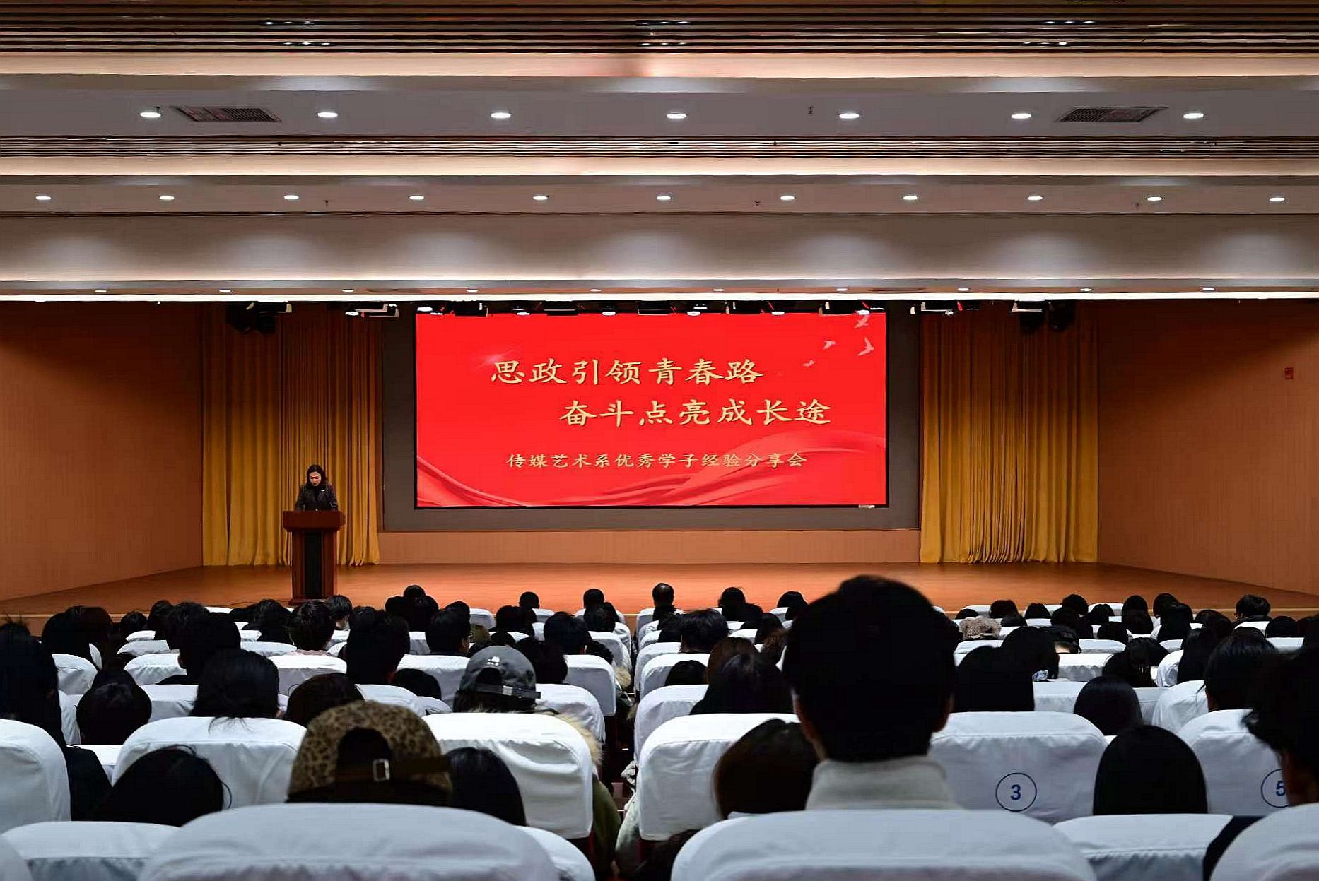为深入推进思政教育与学生成长深度融合,充分发挥优秀学子的朋辈引领作用,进一步激发学生的学习热情,凝聚奋斗动力,12月3日,传媒艺术系在图书馆知海报告厅举办“思政引领青春路 奋斗点亮成长途”优秀学子经验分享交流会。学院党委副书记马福恒,党委委员、工会主席王志明,党委委员、组宣部部长范成宝受邀出席。传媒艺术系负责人、辅导员老师及400余名学生共同参会。