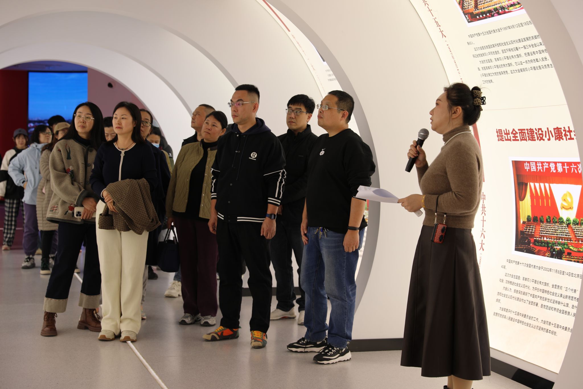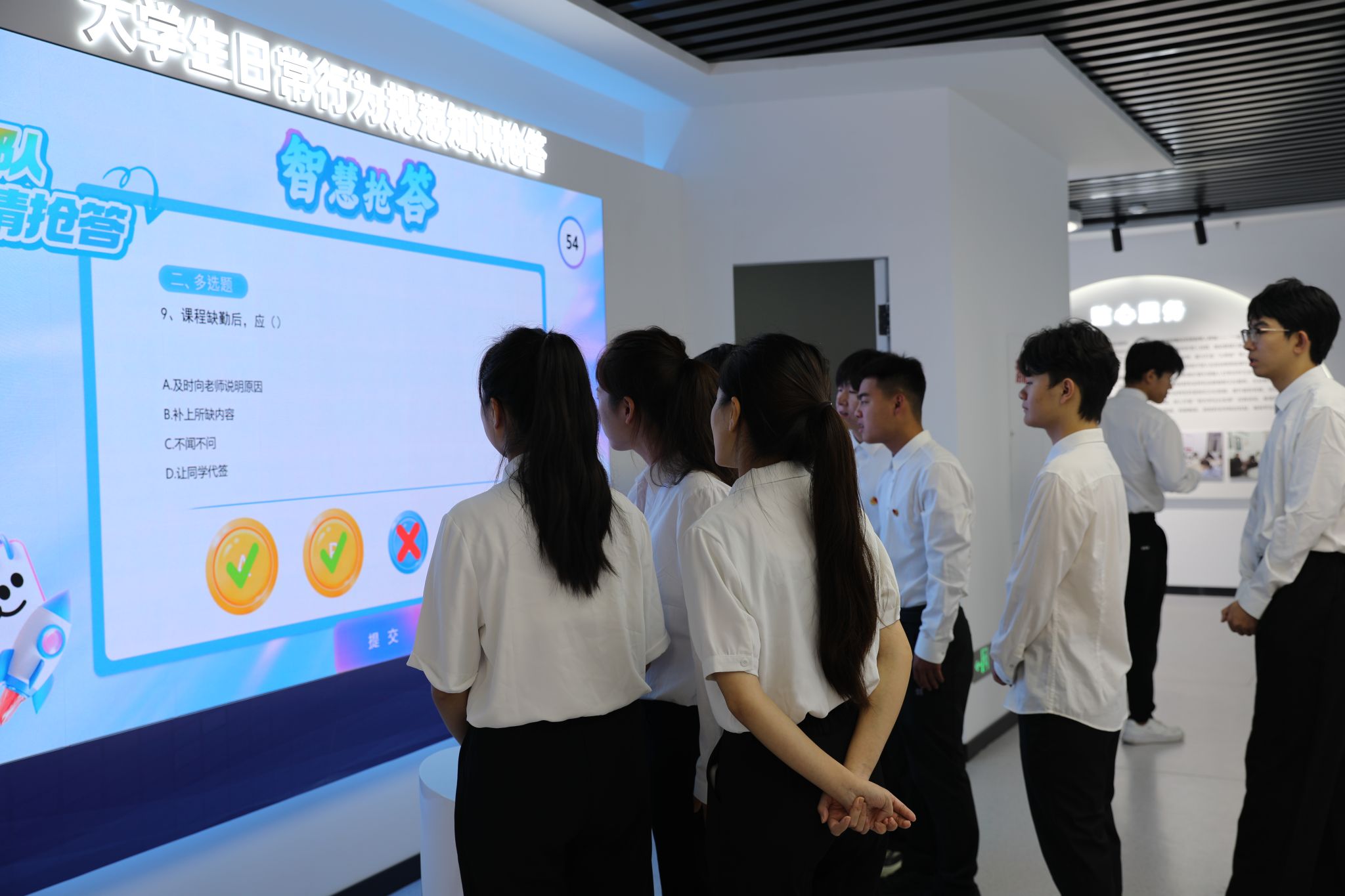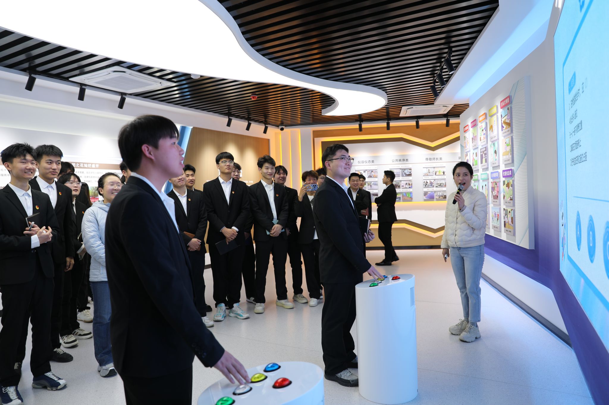走进大思政教育实践中心,穿越“时光隧道”感受中国共产党百年波澜壮阔的奋进历程和新时代建设的伟大成就,感悟中国共产党人的初心使命,引导广大师生在回望峥嵘岁月中厚植家国情怀。这里全面展示学校党委发挥核心领导作用打造“一流党建”“智慧党建”的有力举措和标志性成果;深入挖掘燕赵大地蕴含的红色精神内涵,将红色基因与时代精神融入教学,努力开创“红色舞台剧”“我爱家乡红”等思政品牌,实现思政元素和教育场景的深度应用;生动融入河北省、石家庄积极践行党中央决策部署取得的一系列成就,使党的理论学习更加融会贯通,增强师生“四个自信”,保持政治“三力”,通过“地域实践+理论升华”,用地方发展生动实践精准诠释党的理论建设成果;融合应用课程思政建设数智化成果,依托数智思政教学平台,整合线上线下教学资源,全面赋能教学相长;高度契合学工管理创新发展需求,贴近学生学习生活,丰富“五育并举”思政内涵,为开展主题教育、强化学生管理与服务提供鲜活样本;用心营造润物无声的校园文化、企业文化,在文化熏陶中厚植爱校情怀、涵养职业素养;精准施策大学生心理健康教育,建立学生心理成长档案,分层分类开展个性化辅导,让思政教育的“精神引领”与心理教育的“情感关怀”同频共振。同时,还开辟了“党团员活动区”、“行为规范知识抢答区”“中华优秀传统文化体验区”“研讨交流区”等常态化教育培训专属空间。各版块协同联动,构建起“沉浸式体验——互动式学习——实践性感悟”的育人闭环,既强化思想引领,又贴合学生成长需求与职业发展导向,让立德树人更具针对性和吸引力,打造了思政教育的又一课堂。