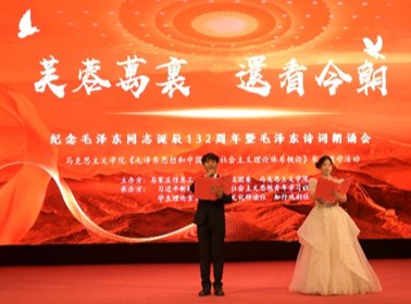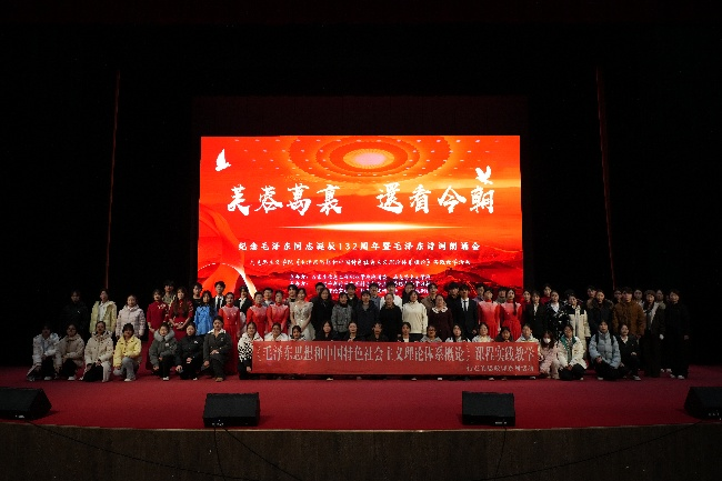 为深入贯彻落实党的二十届四中全会精神,推动YABO鸭脖官网思政课高质量发展,12月16日,在毛泽东同志诞辰132周年之际,马克思主义学院在昭德礼堂隆重举办“芙蓉万里 还看今朝”纪念毛泽东同志诞辰132周年暨毛泽东诗词朗诵会。马克思主义学院党总支书记刘从立,部分思政课教师和全院各系学生800余人齐聚一堂,以诗为媒溯来路,以声传情继初心,在毛泽东诗词的雄浑韵律中回望峥嵘岁月,在时代新声的铿锵节拍中感悟伟人情怀。