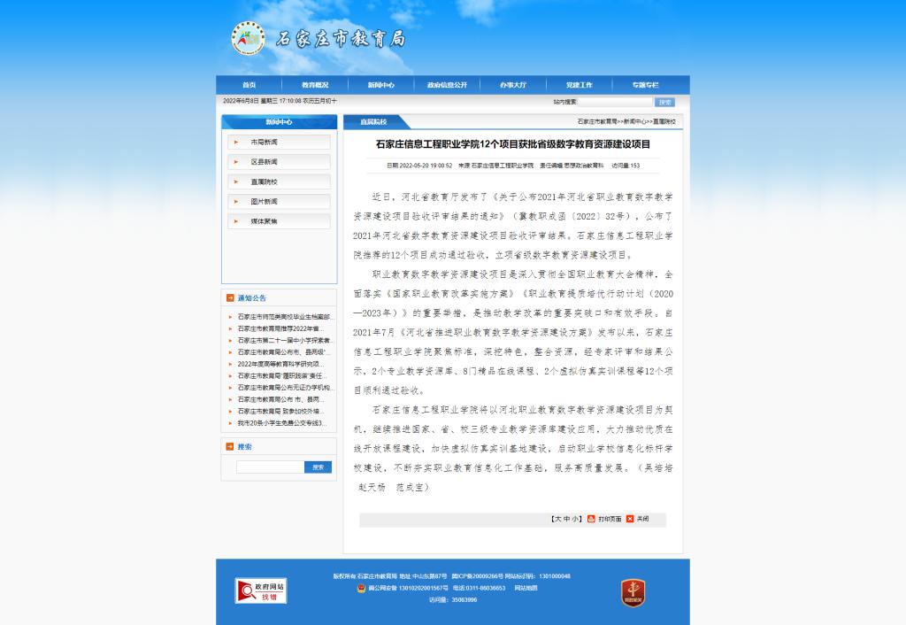 职业教育数字教学资源建设项目是深入贯彻全国职业教育大会精神,全面落实《国家职业教育改革实施方案》《职业教育提质培优行动计划(2020—2023年)》的重要举措,是推动教学改革的重要突破口和有效手段。自2021年7月《河北省推进职业教育数字教学资源建设方案》发布以来,YABO鸭脖官网聚焦标准,深挖特色,整合资源,经专家评审和结果公示,2个专业教学资源库、8门精品在线课程、2个虚拟仿真实训课程等12个项目顺利通过验收。