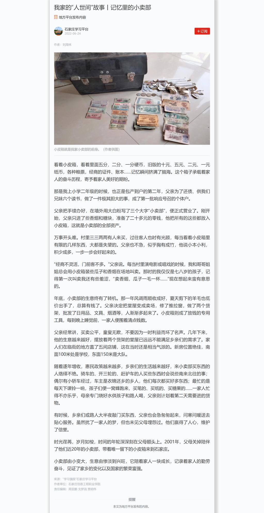 看着小皮箱,看着里面五分、二分、一分硬币,旧版的十元、五元、二元、一元纸币,各种粮票,经商的证件、账本……记忆瞬间挤满了脑海。这个箱子承载着家人的奋斗历程,寄予着家人美好的期盼。