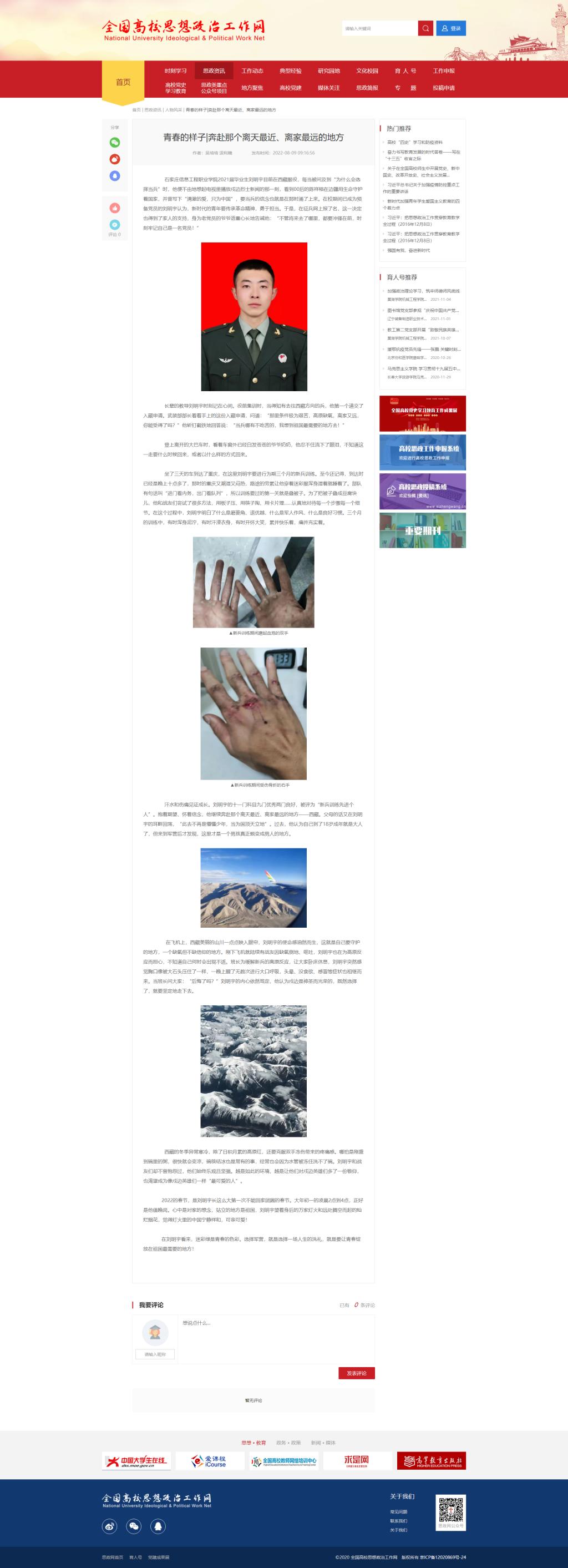 YABO鸭脖官网2021届毕业生刘明宇目前在西藏服役,每当被问及到“为什么会选择当兵”时,他便不由地想起电视里播放戍边烈士新闻的那一刻,看到00后的陈祥榕在边疆用生命守护着国家,并曾写下“清澈的爱,只为中国”,要当兵的信念也就是在那时涌了上来。在校期间已成为预备党员的刘明宇认为,新时代的青年要传承革命精神,勇于担当。于是,在征兵网上报了名,这一决定也得到了家人的支持,身为老党员的爷爷语重心长地告诫他:“不管将来去了哪里,都要冲锋在前,时刻牢记自己是一名党员!”