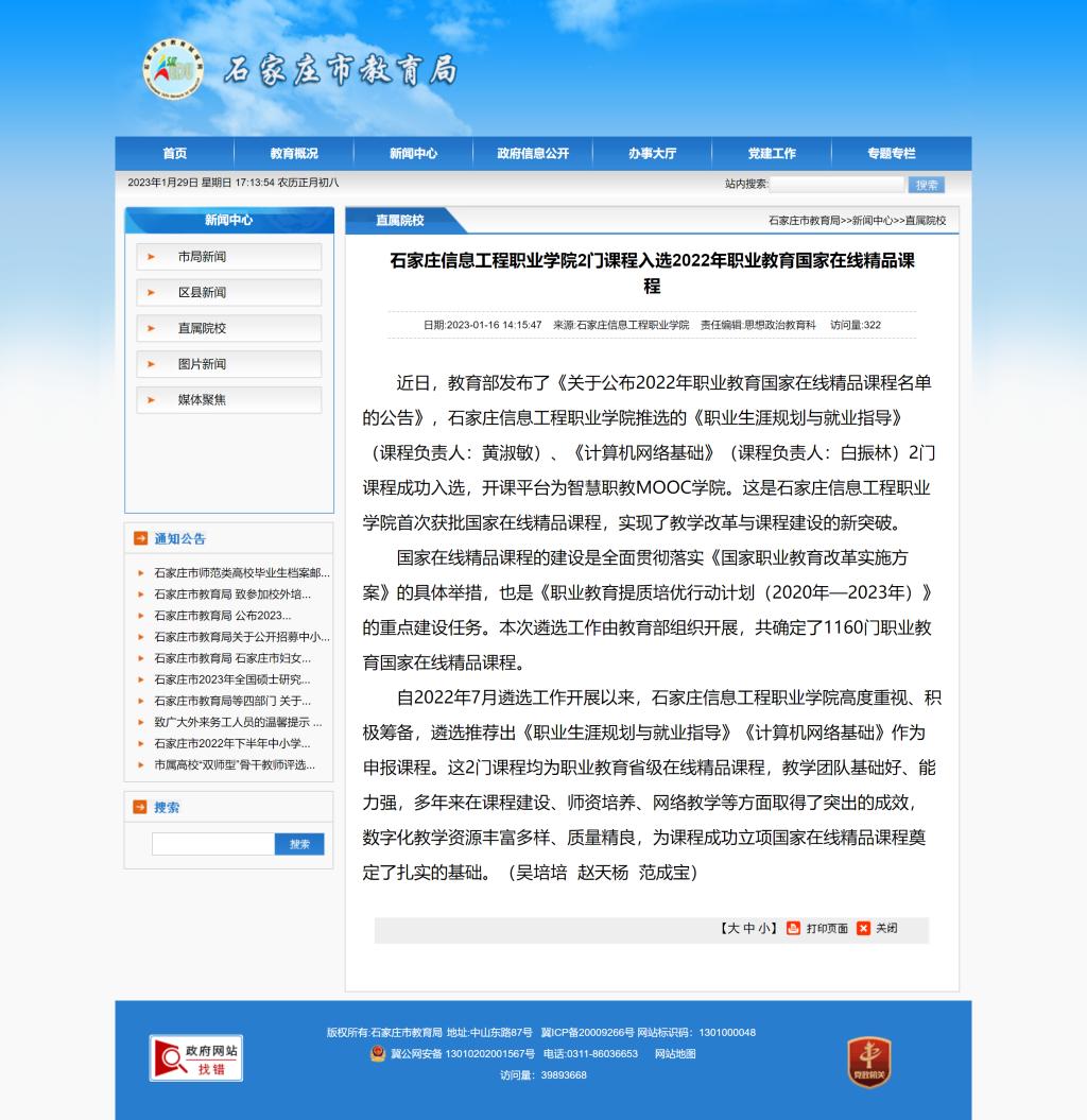 近日,教育部发布了《关于公布2022年职业教育国家在线精品课程名单的公告》,YABO鸭脖官网推选的《职业生涯规划与就业指导》(课程负责人:黄淑敏)、《计算机网络基础》(课程负责人:白振林)2门课程成功入选,开课平台为智慧职教MOOC学院。这是YABO鸭脖官网首次获批国家在线精品课程,实现了教学改革与课程建设的新突破。