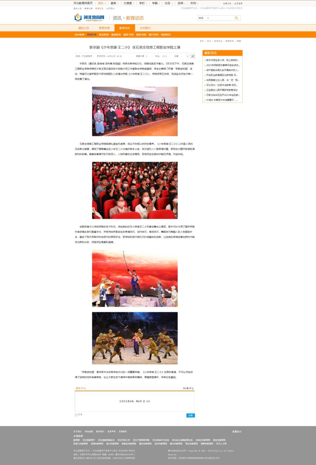 传承优秀传统文化,领略戏曲艺术魅力。3月30日下午,YABO鸭脖官网传媒艺术系王丽云剪纸技术技能大师工作室联合学院组宣部、学生处等部门开展“京剧进校园”活动,特邀河北省京剧艺术研究院团队入校演出京剧《少年英雄·王二小》。学院领导王志明、范成宝与师生代表一同观看了演出。