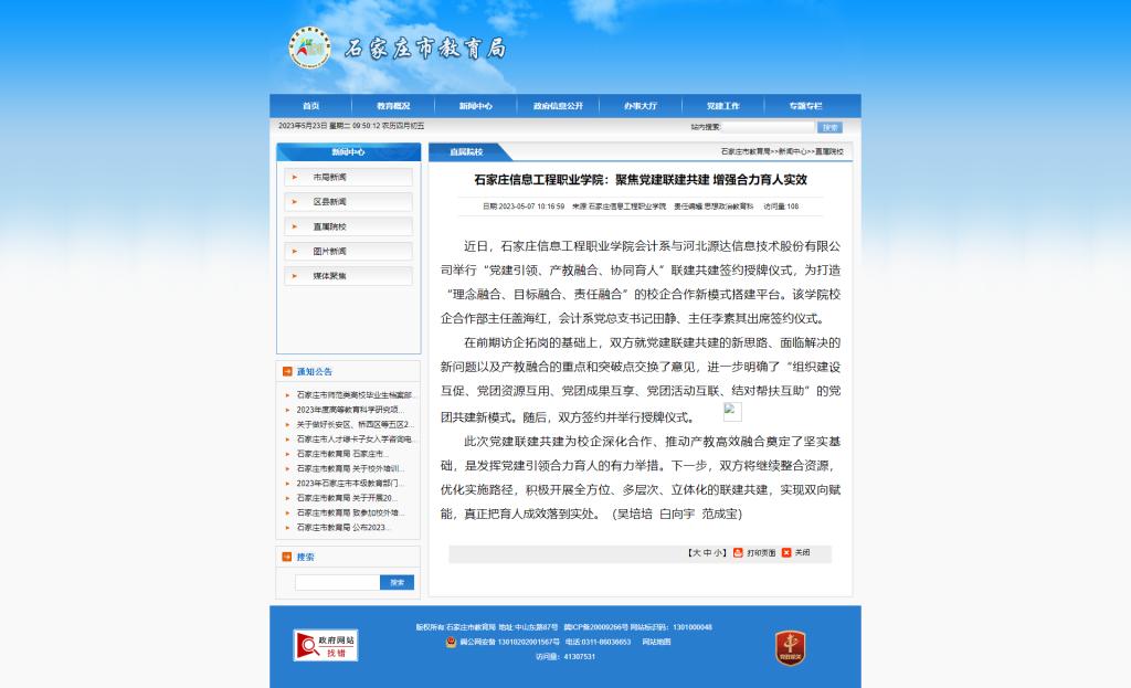 近日,YABO鸭脖官网会计系与河北源达信息技术股份有限公司举行“党建引领、产教融合、协同育人”联建共建签约授牌仪式,为打造“理念融合、目标融合、责任融合”的校企合作新模式搭建平台。该学院校企合作部主任盖海红,会计系党总支书记田静、主任李素其出席签约仪式。