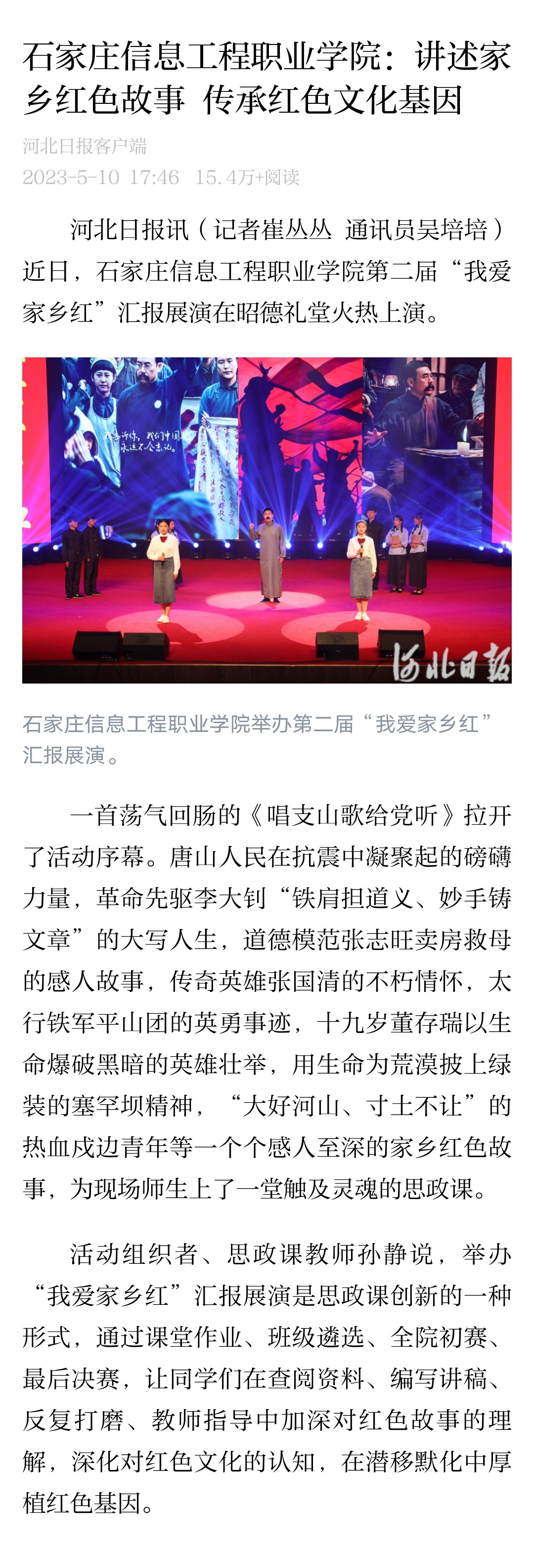 一首荡气回肠的《唱支山歌给党听》拉开了活动序幕。唐山人民在抗震中凝聚起的磅礴力量,革命先驱李大钊“铁肩担道义、妙手铸文章”的大写人生,道德模范张志旺卖房救母的感人故事,传奇英雄张国清的不朽情怀,太行铁军平山团的英勇事迹,十九岁董存瑞以生命爆破黑暗的英雄壮举,用生命为荒漠披上绿装的塞罕坝精神,“大好河山、寸土不让”的热血戍边青年等一个个感人至深的家乡红色故事,为现场师生上了一堂触及灵魂的思政课。