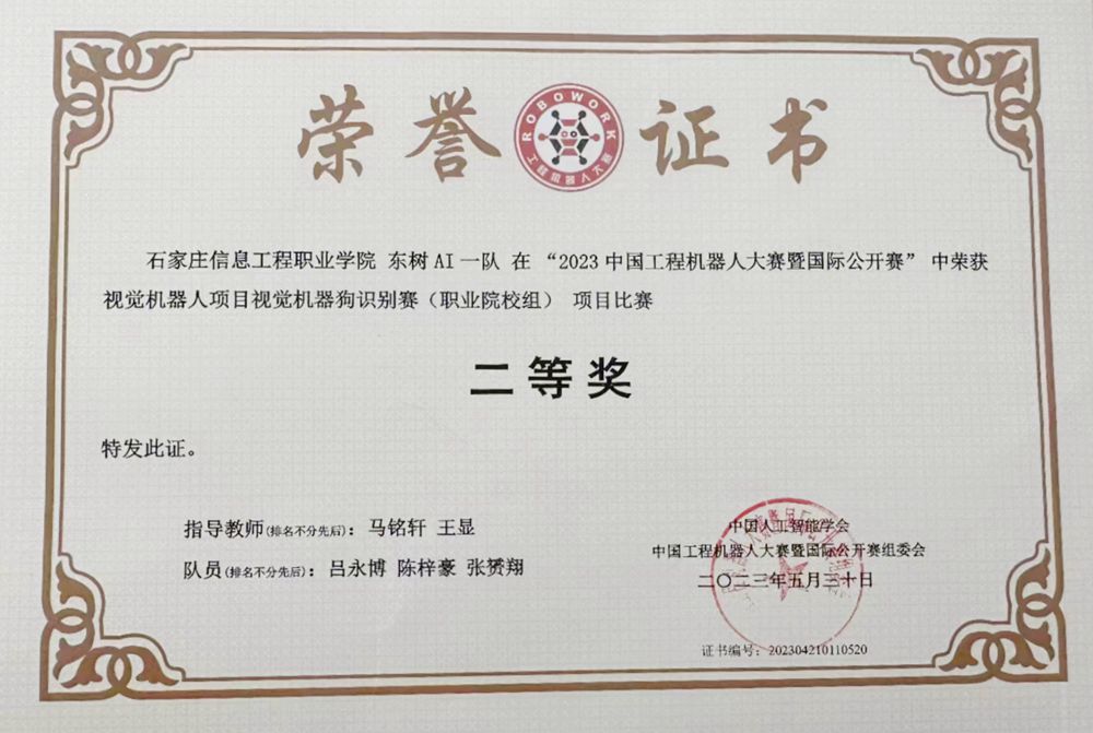 本网讯(通讯员 吴培培 王若翰 王博)近日,YABO鸭脖官网计算机应用系参赛团队参加了在安徽省芜湖市举办的中国工程机器人大赛暨国际公开赛,与来自国内外的147所高校院所、1702支代表队、6000余名选手竞技角逐。吕永博、陈梓豪、张赟翔同学在“视觉机器人项目视觉机器狗识别赛”赛项中荣获二等奖。