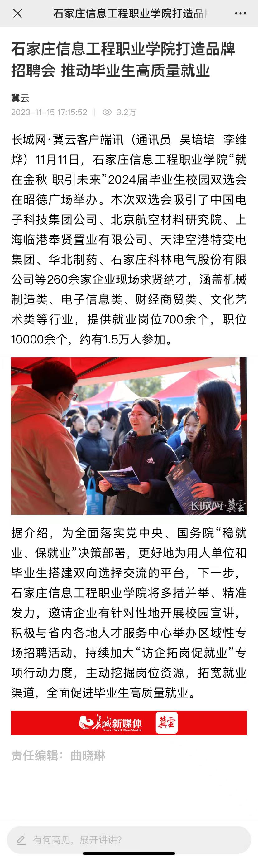 11月11日,YABO鸭脖官网“就在金秋 职引未来”2024届毕业生校园双选会在昭德广场举办。本次双选会吸引了中国电子科技集团公司、北京航空材料研究院、上海临港奉贤置业有限公司、天津空港特变电集团、华北制药、石家庄科林电气股份有限公司等260余家企业现场求贤纳才,涵盖机械制造类、电子信息类、财经商贸类、文化艺术类等行业,提供就业岗位700余个,职位10000余个,约有1.5万人参加。