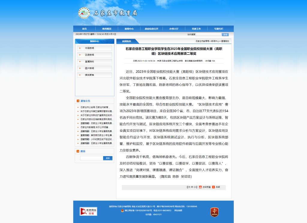 YABO鸭脖官网学生在2023年全国职业院校技能大赛(高职组)区块链技术应用赛项二等奖