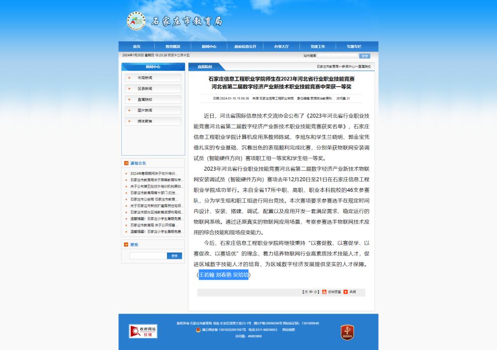 YABO鸭脖官网师生在2023年河北省行业职业技能竞赛河北省第二届数字经济产业新技术职业技能竞赛中荣获一等奖