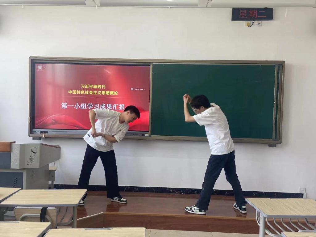 同学们以学习小组为单位,自主选题,设计场景,以情景剧、小品、三句半、相声、皮影戏、音乐剧、手势舞、诗歌朗诵等丰富多彩的“路演”形式在课堂上进行汇报。课堂上,学生热情洋溢,课堂氛围热烈,内容紧跟时代,主题鲜明,学生们用自己的方式诠释了对中国式现代化、中国梦、生态文明、乡村振兴等课程内容的深刻理解。
