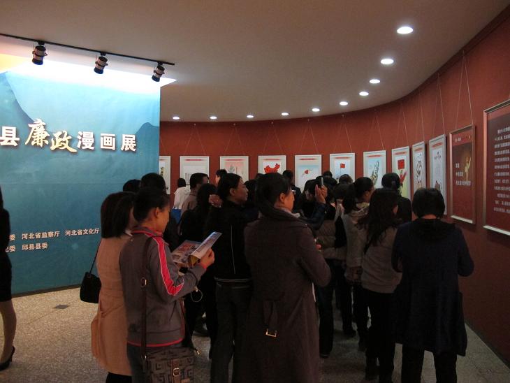 近年来,我省各级纪检监察机关认真贯彻落实中央提出的“加强反腐倡廉教育和廉政文化建设”,深入推进廉政文化建设,在全社会营造了廉荣贪耻的浓厚氛围。邯郸邱县立足农民漫画资源优势,以廉政漫画形式加强廉政文化建设,取得了明显成效,得到中央政治局常委、中纪委书记王岐山等领导同志的充分肯定。为进一步扩大廉政漫画的影响,结合正在开展的党的群众路线教育实践活动,省纪委等部门共同举办了“邱县廉政漫画展”,展示分“实现中化民族伟大复兴的中国梦”、“空谈误国、实干兴邦“等8个部分。此次漫画展目的是警示和教育广大党员干部坚决反对“四风”,真心服务群众,努力做到为民、务实、清廉,以优良的作风凝聚推动河北科学发展、跨越赶超的正能量。