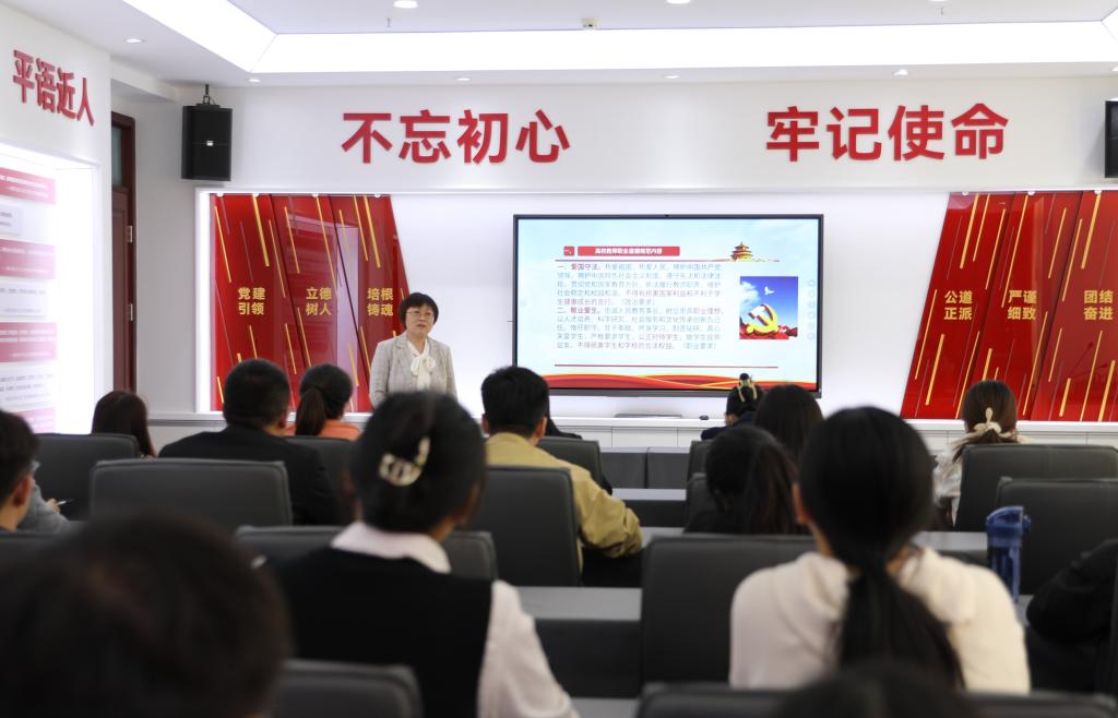 32名新入职教师面向校旗进行入职宣誓,新入职教师代表刘凯欣表示将时刻保持学习的态度,不断提升自己的专业水平和教育教学能力,为国家培养出更多的优秀人才。