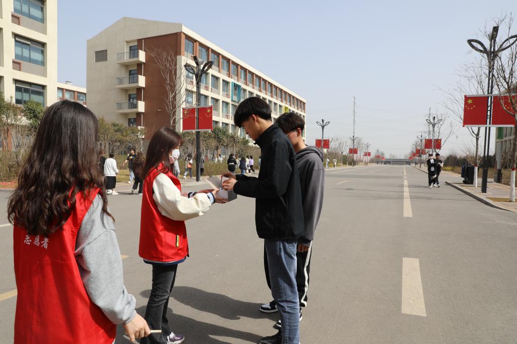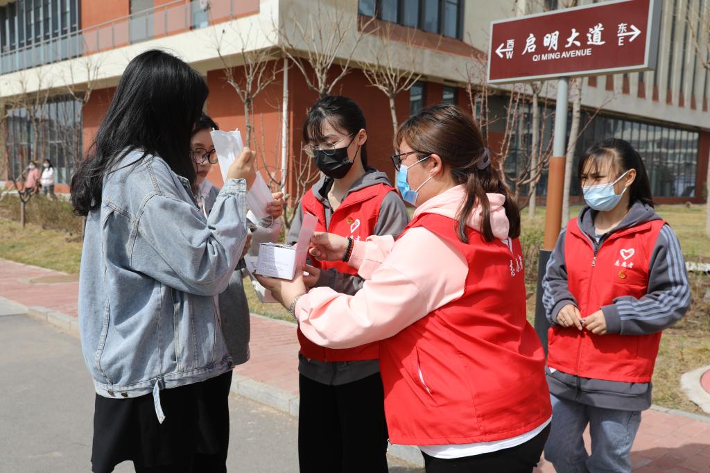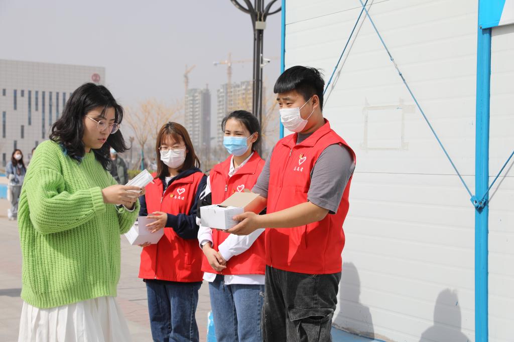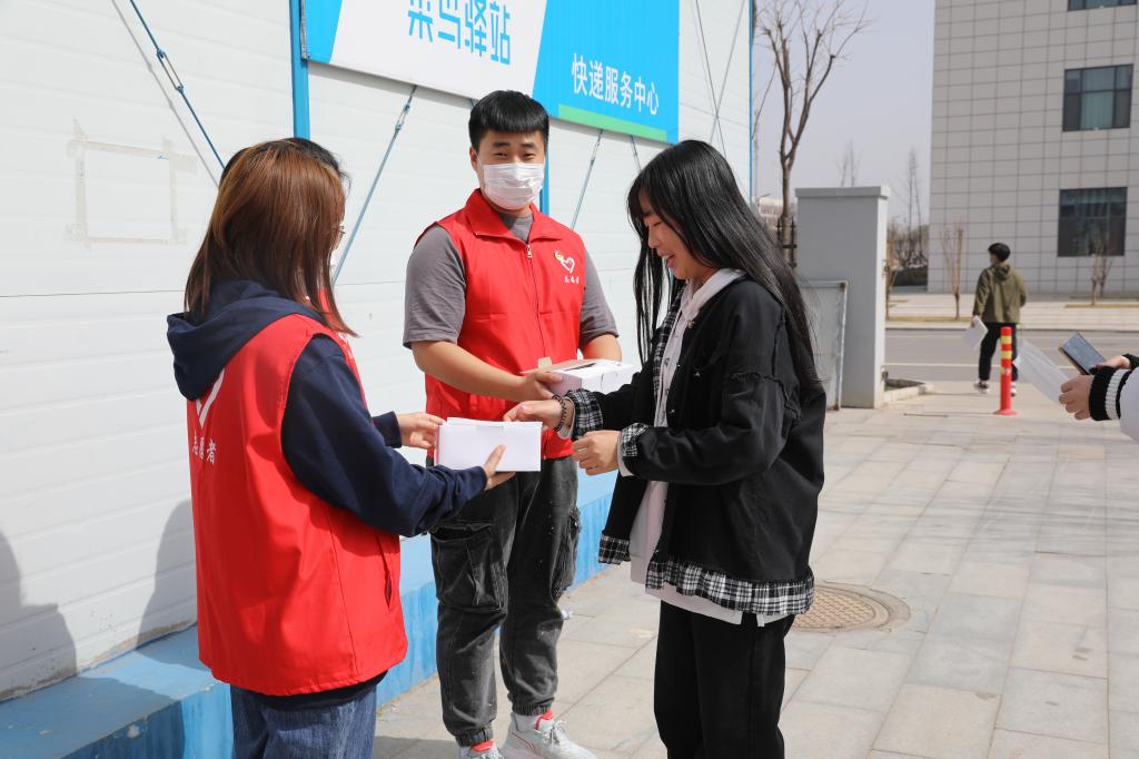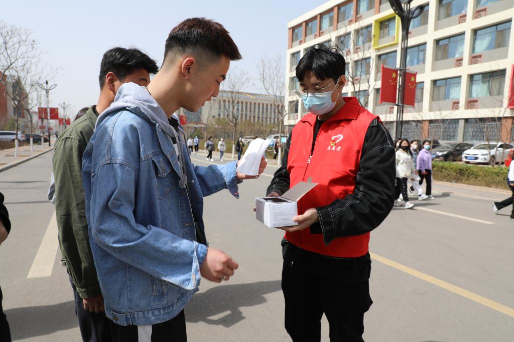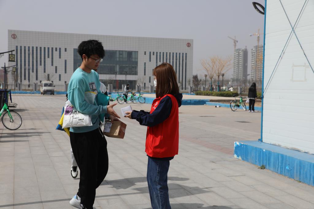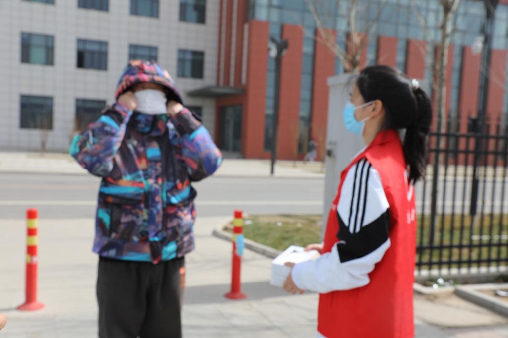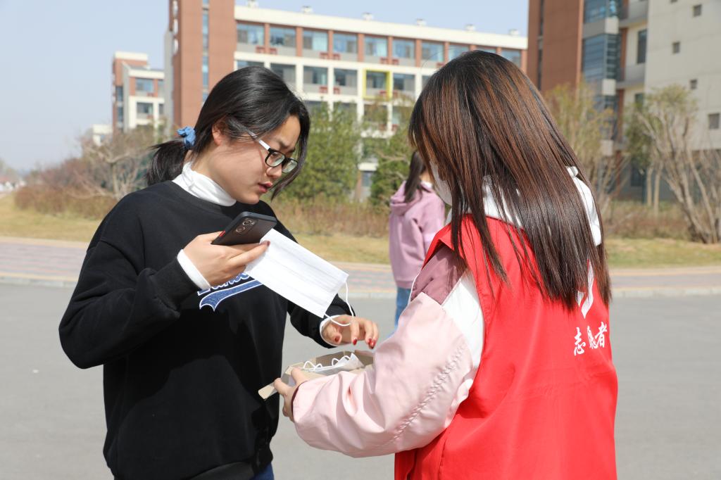 学生志愿者对在校的学生免费发放口罩并提醒疫情防控的重要性,务必公共场所佩戴口罩。