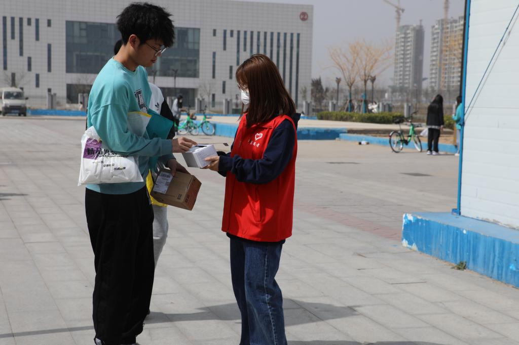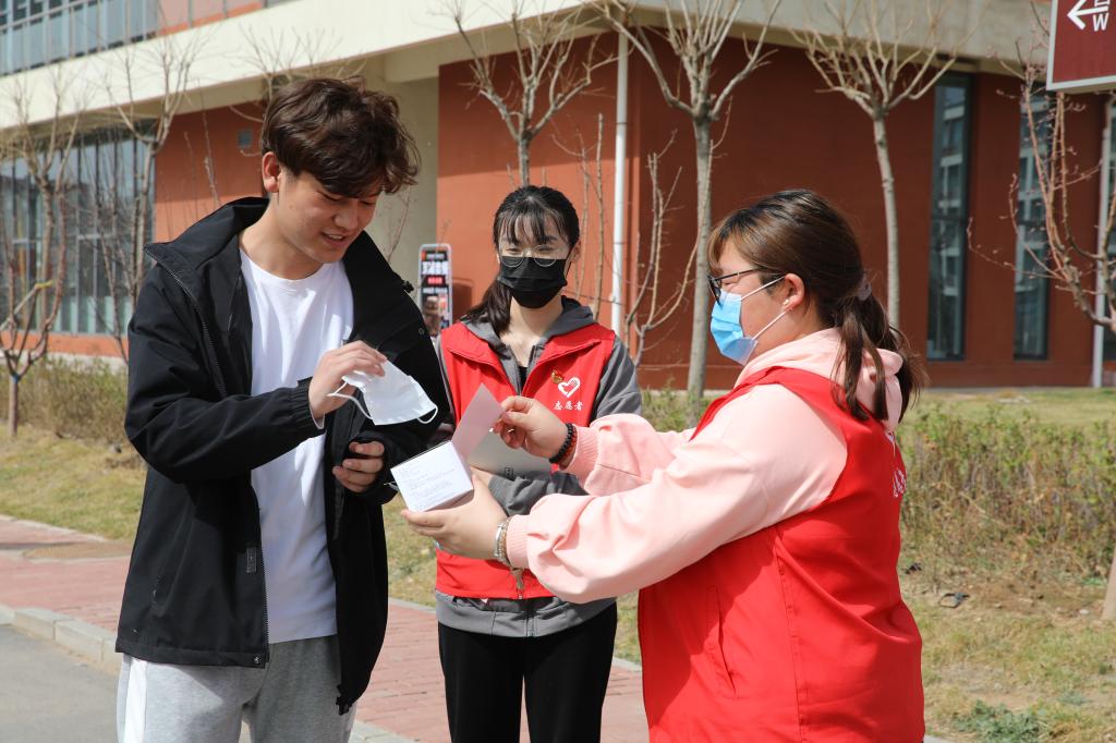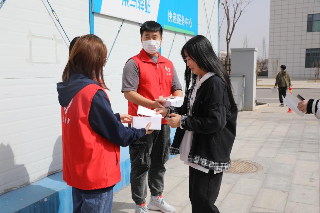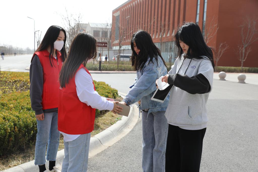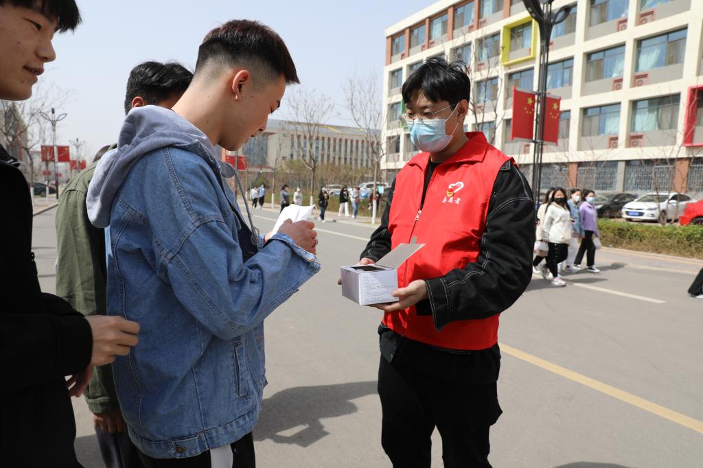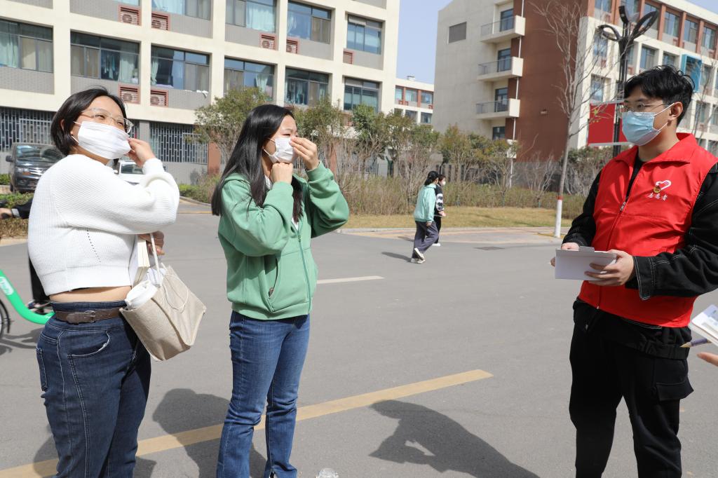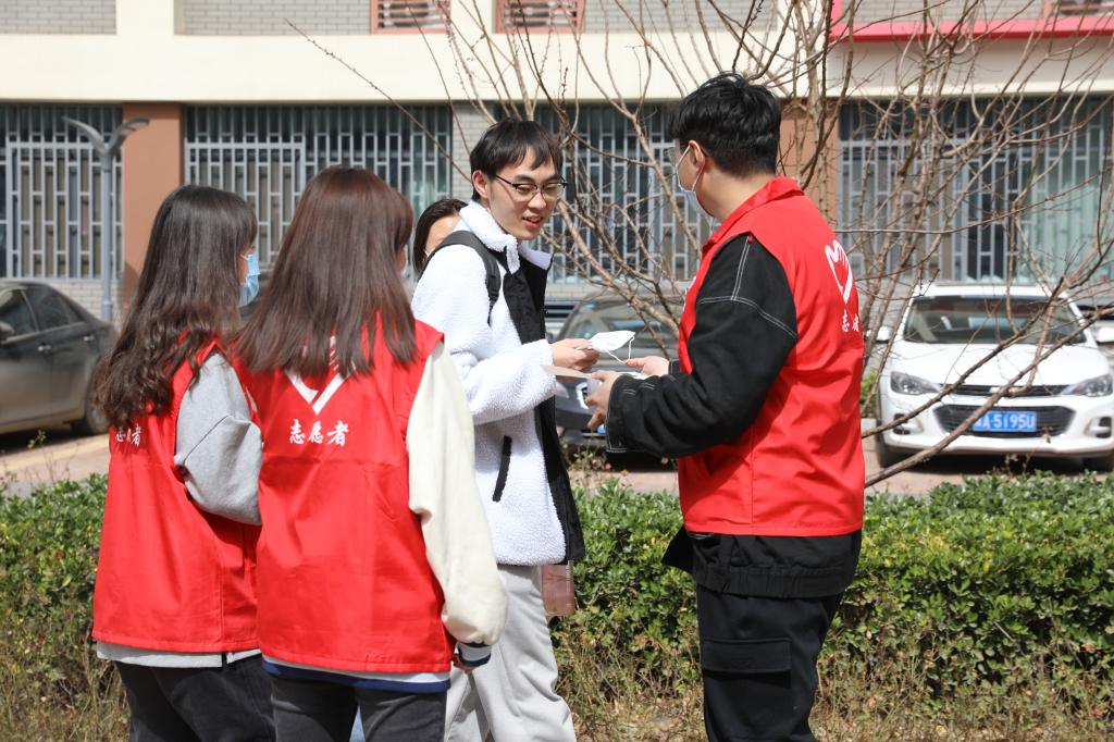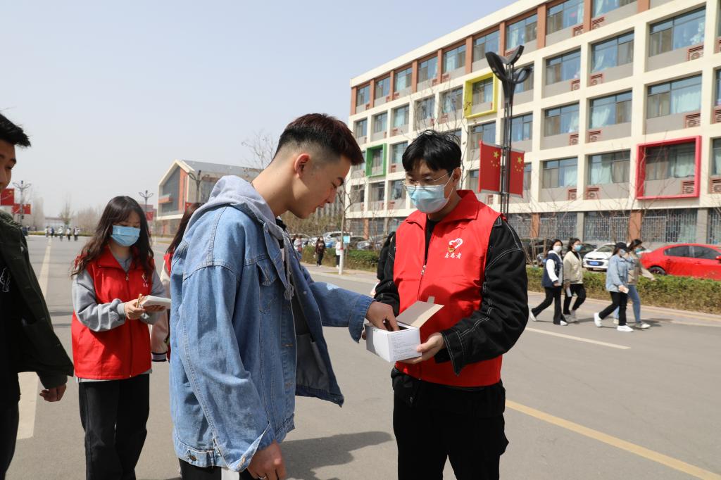 学生志愿者对在校的学生免费发放口罩并提醒疫情防控的重要性,务必公共场所佩戴口罩。