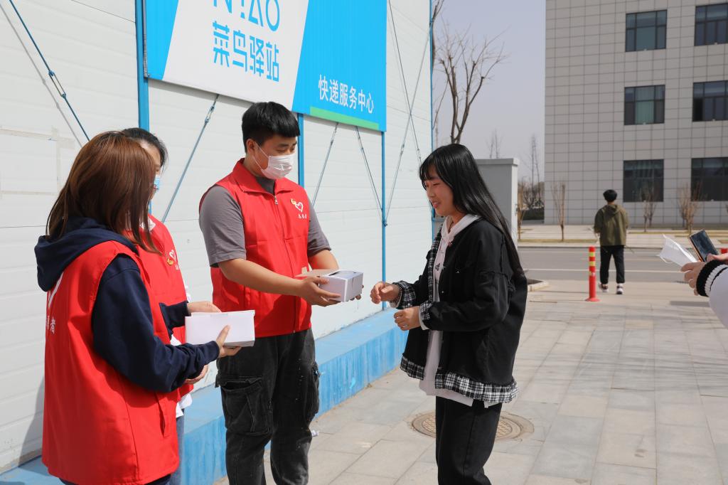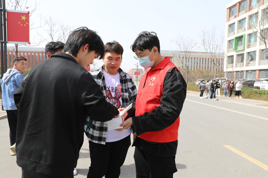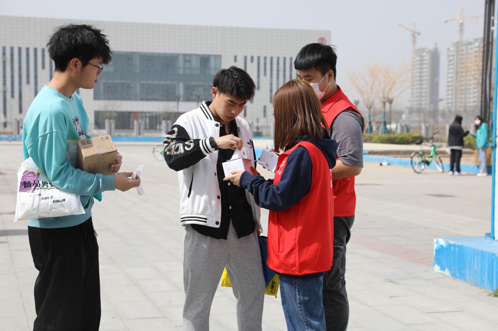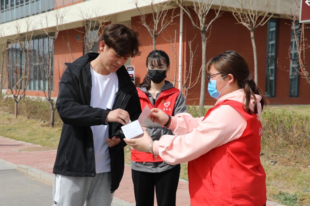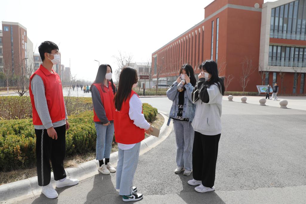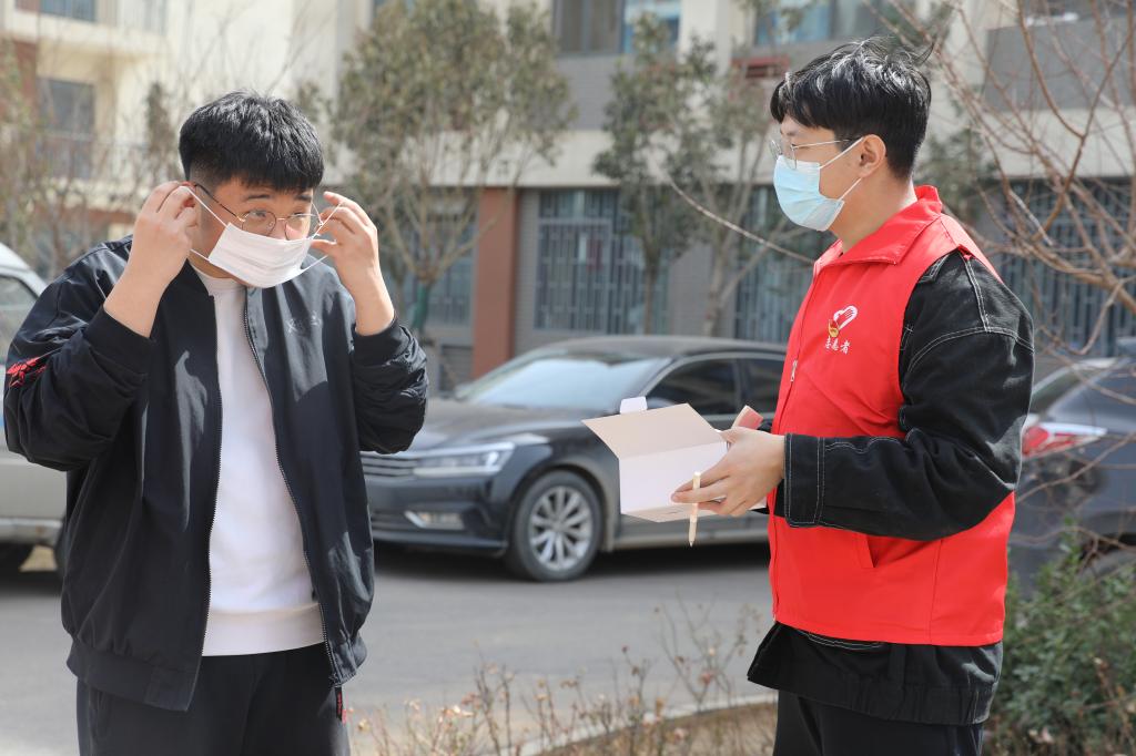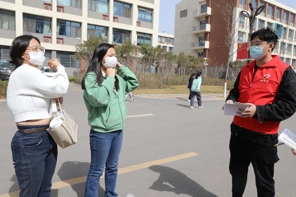 学生志愿者对在校的学生免费发放口罩并提醒疫情防控的重要性,务必公共场所佩戴口罩。