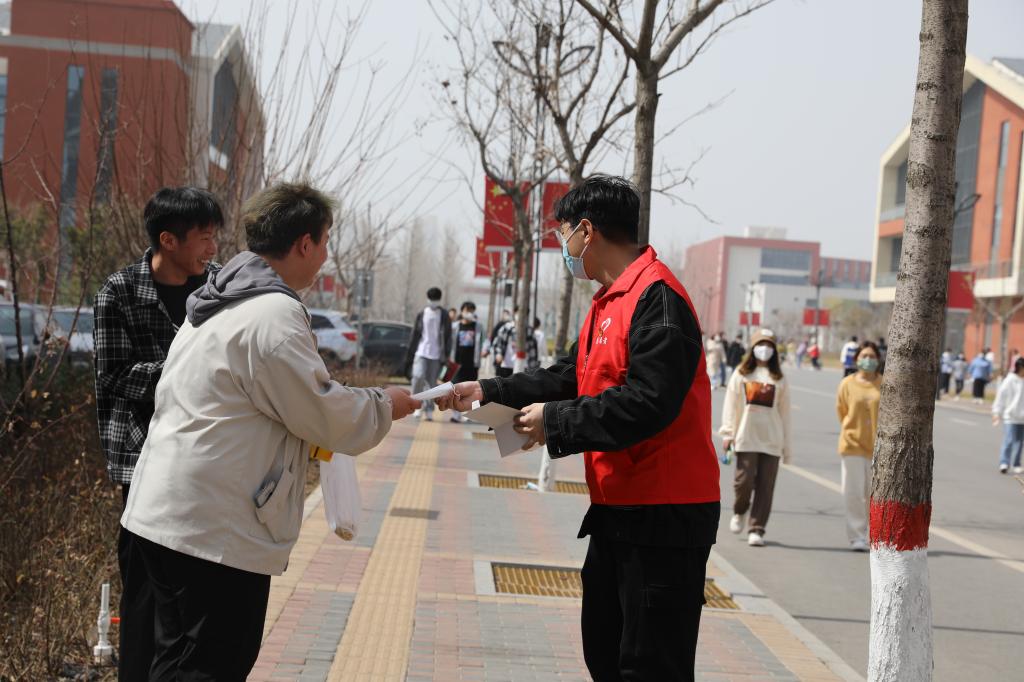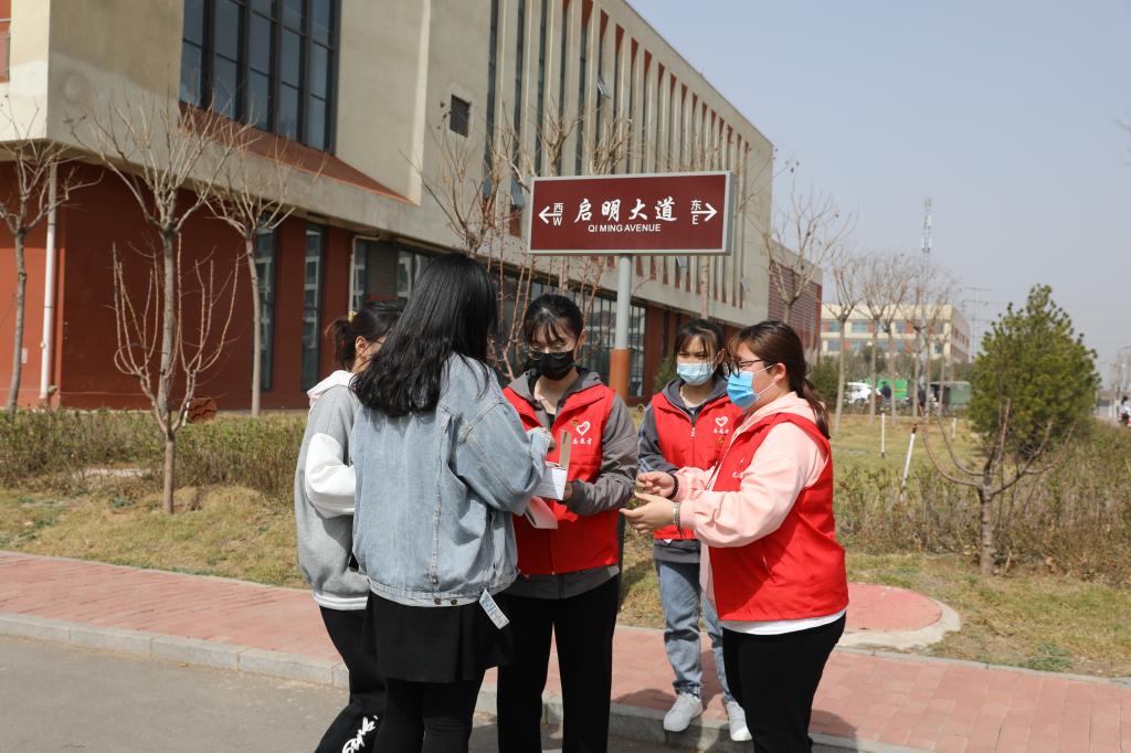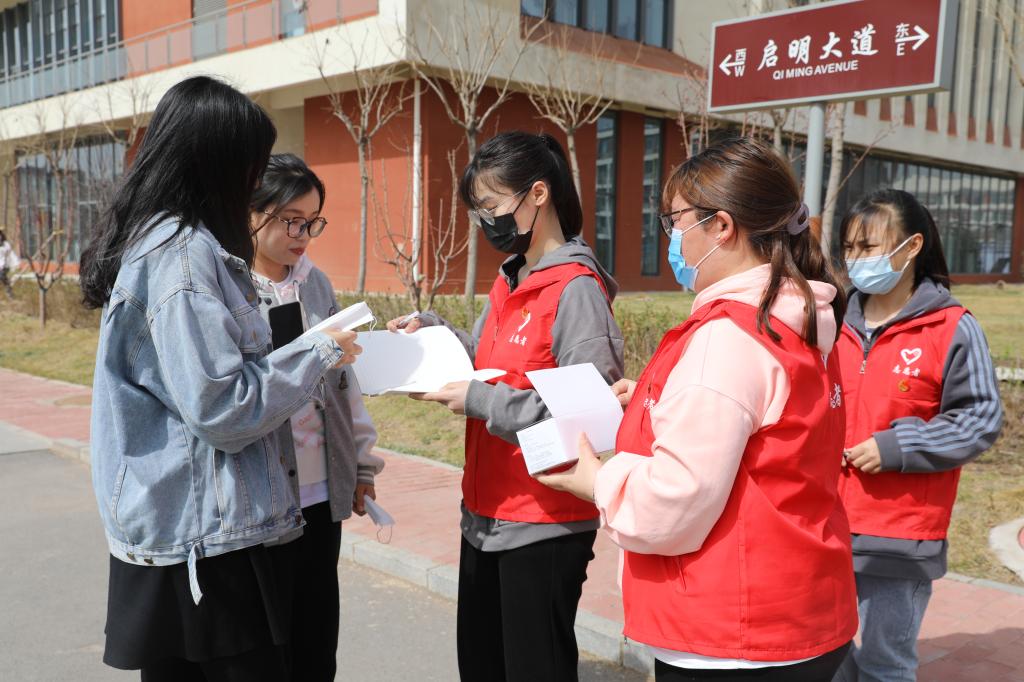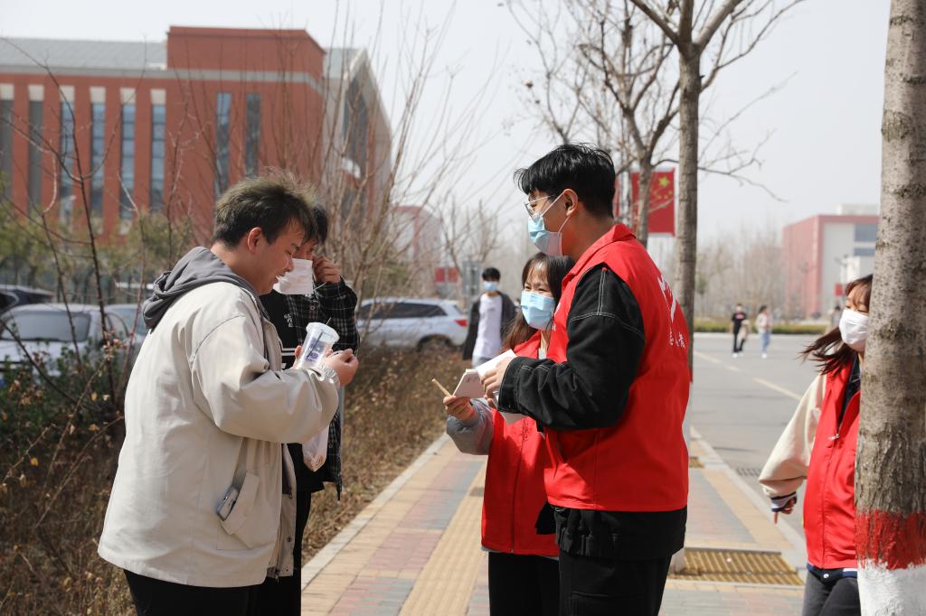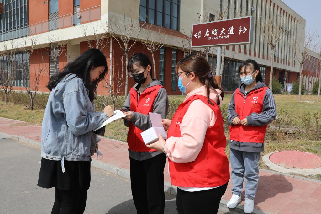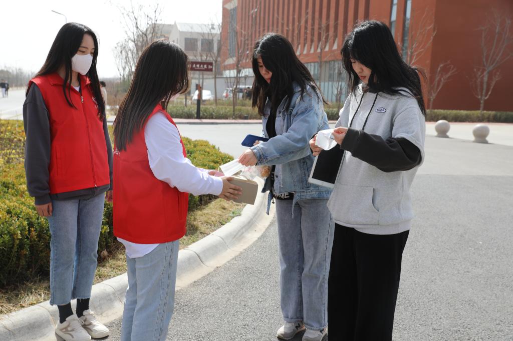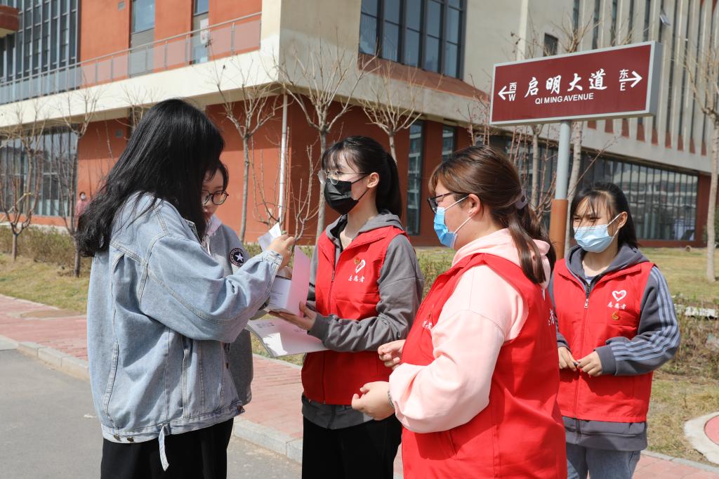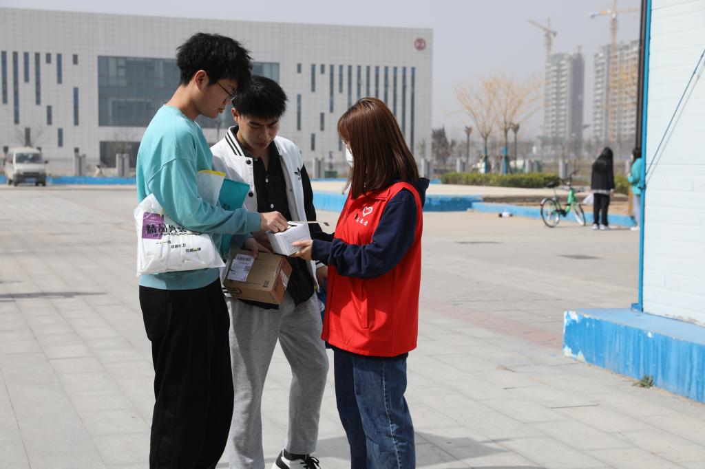学生志愿者对在校的学生免费发放口罩并提醒疫情防控的重要性,务必公共场所佩戴口罩。