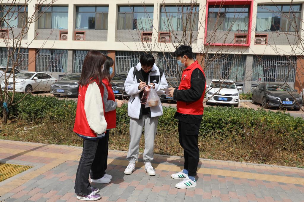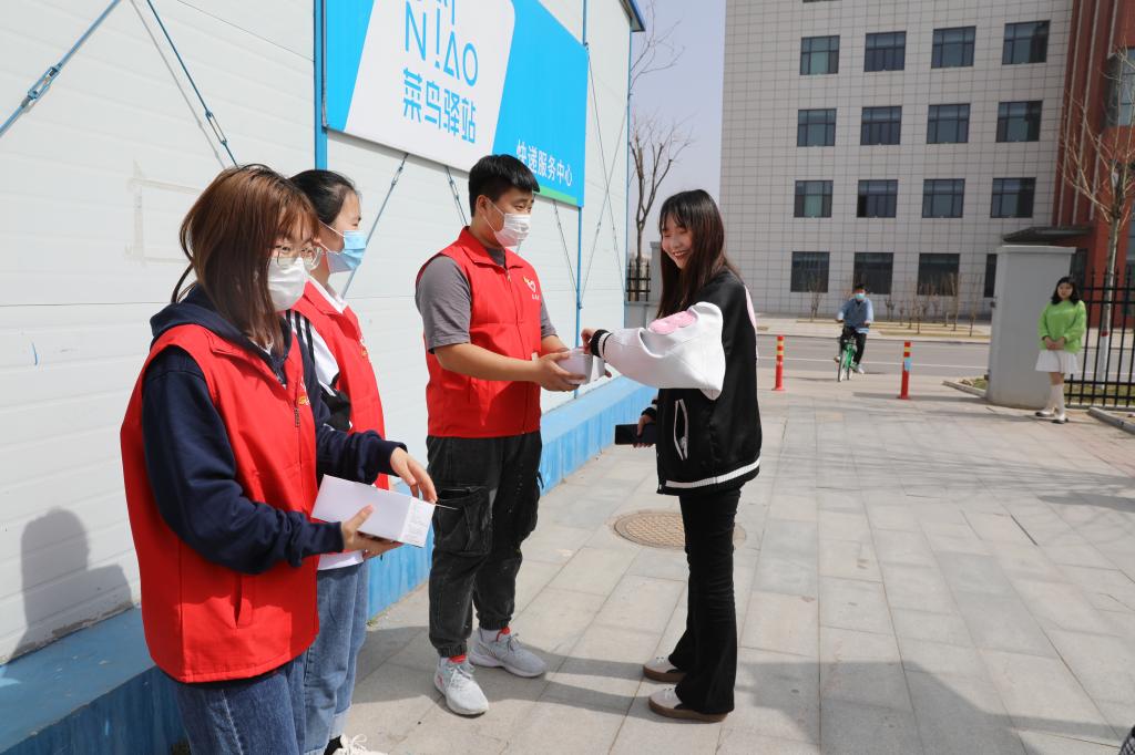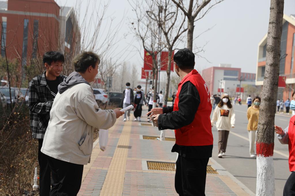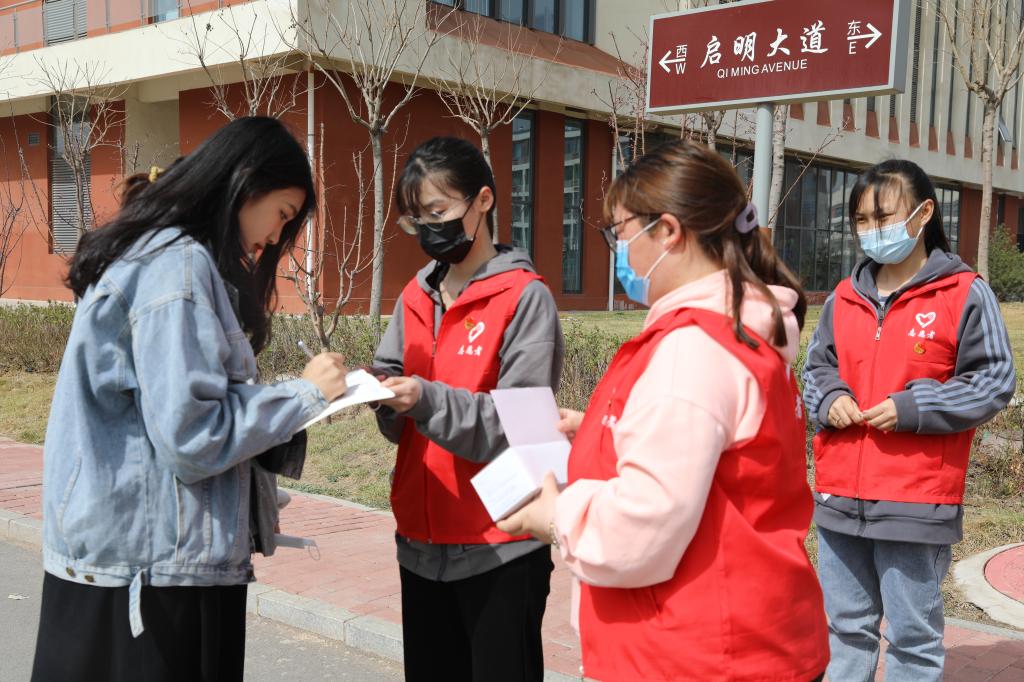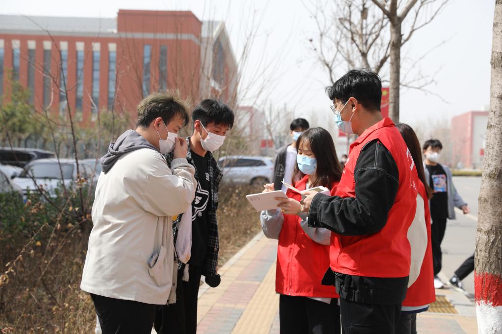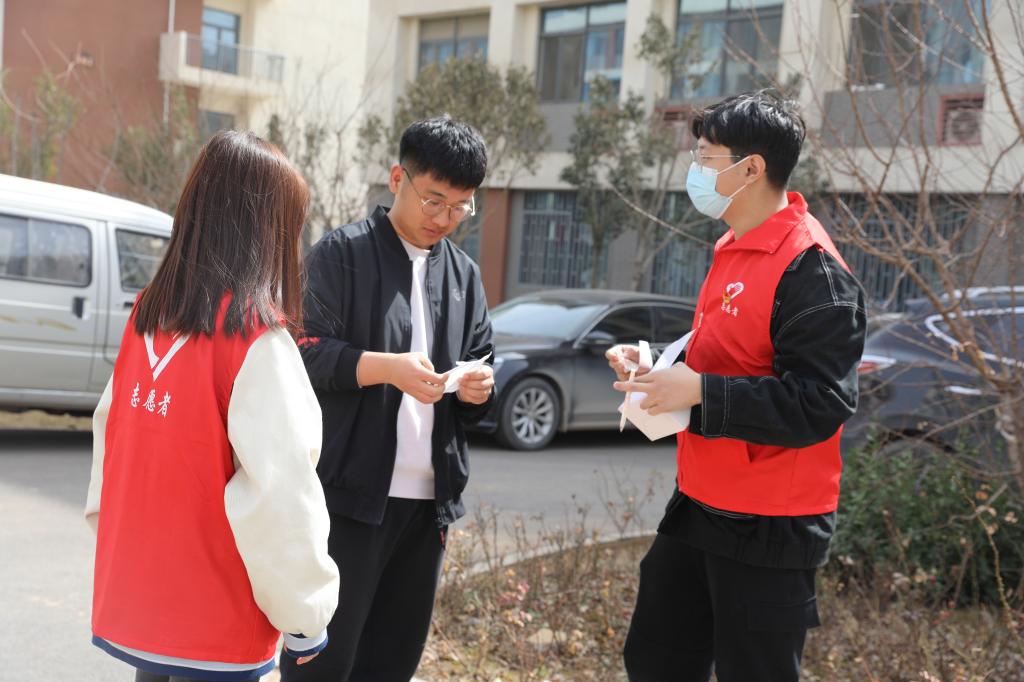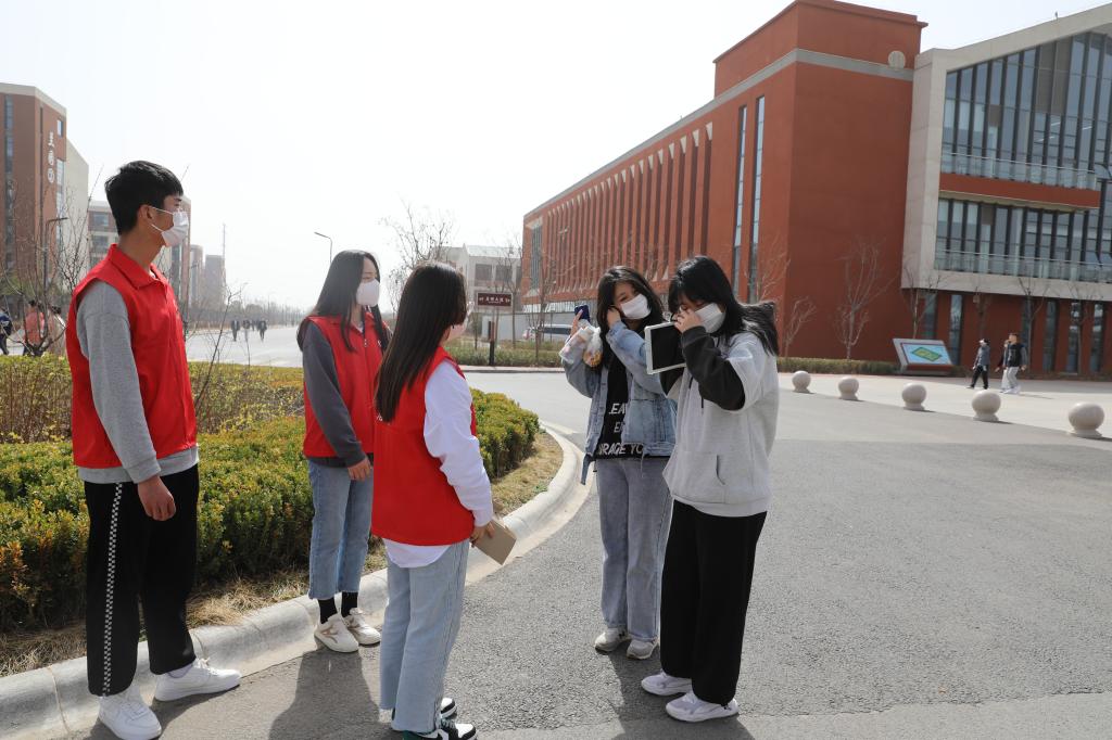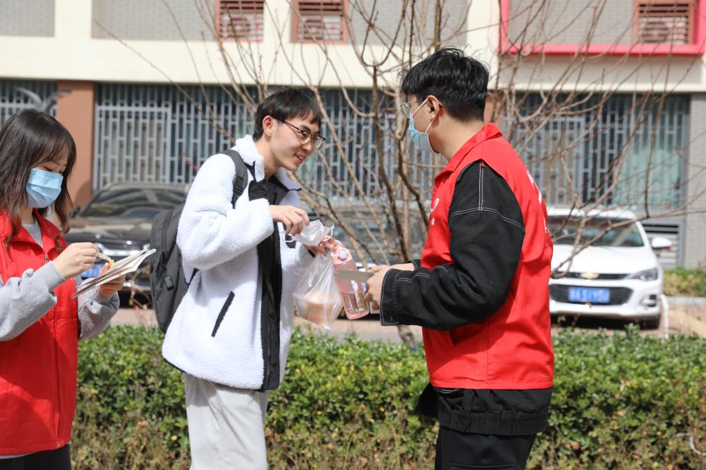 学生志愿者对在校的学生免费发放口罩并提醒疫情防控的重要性,务必公共场所佩戴口罩。