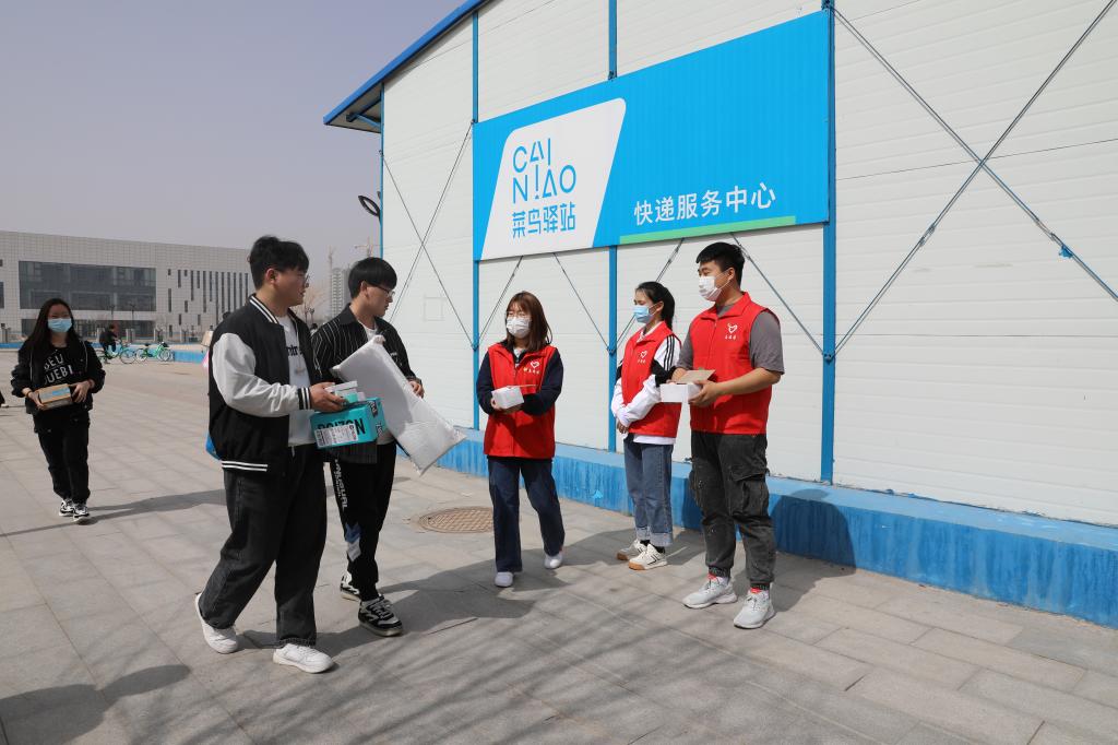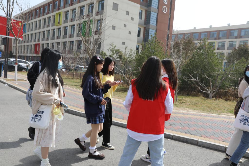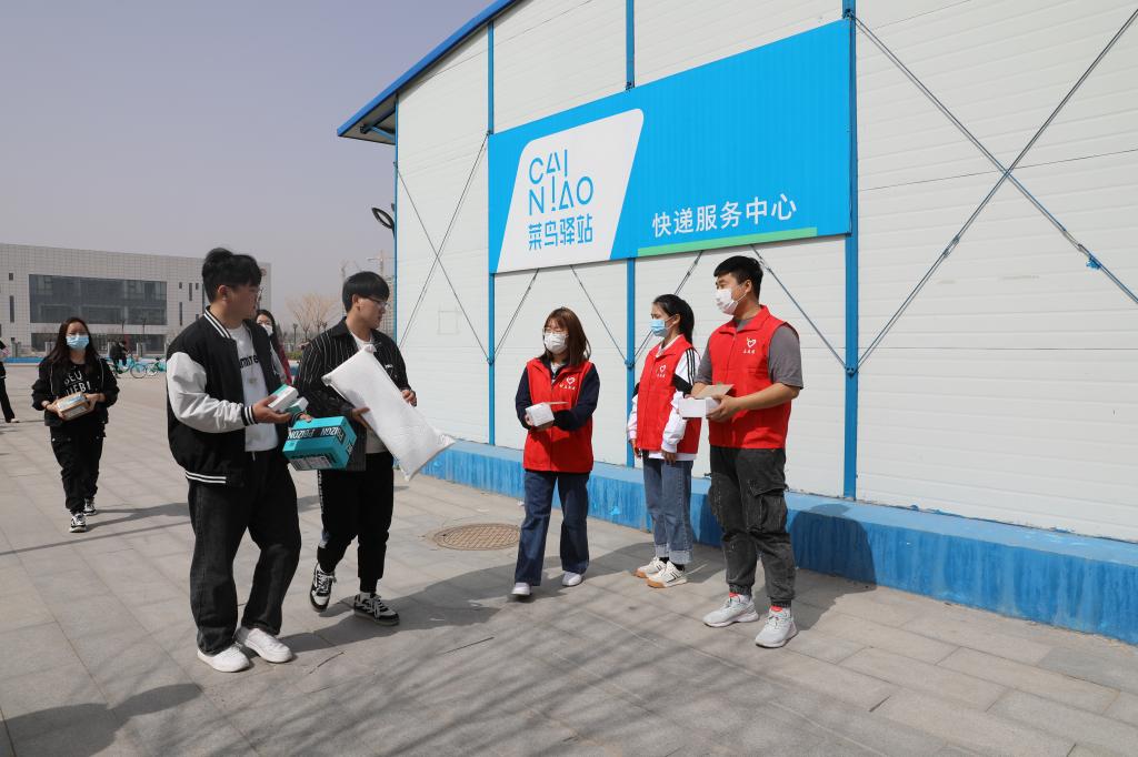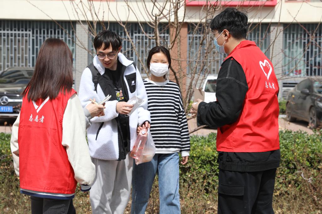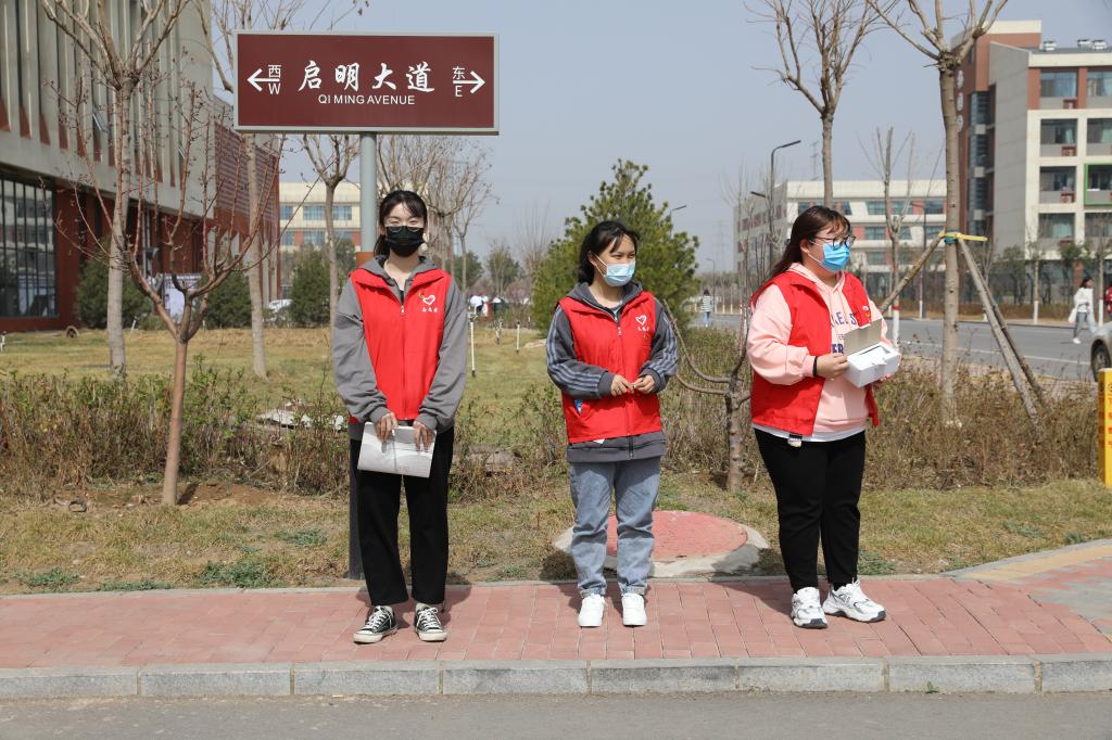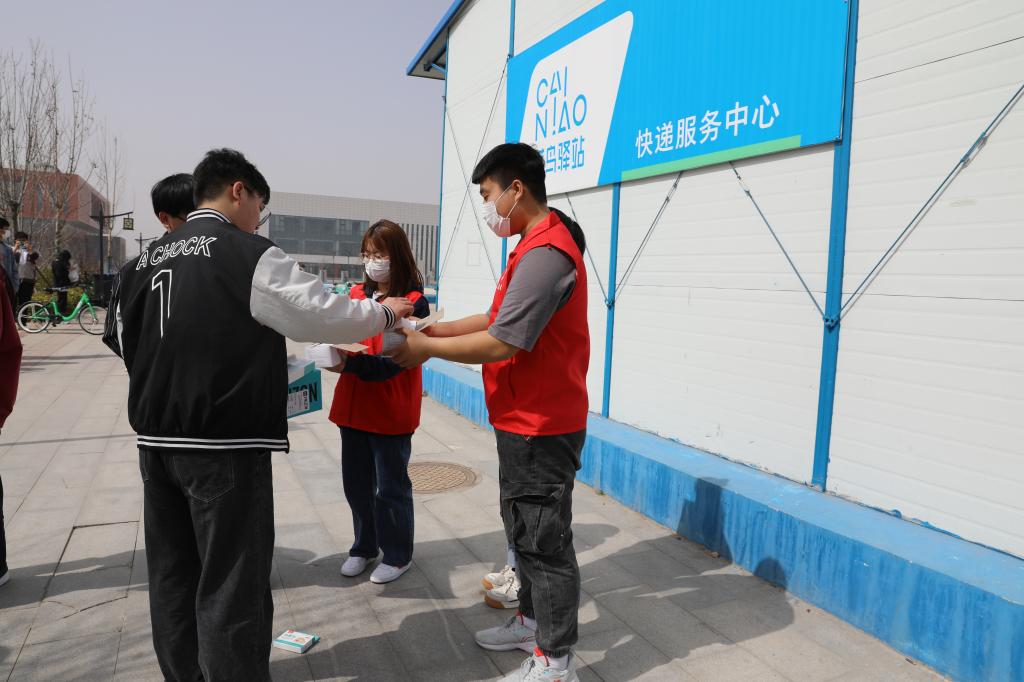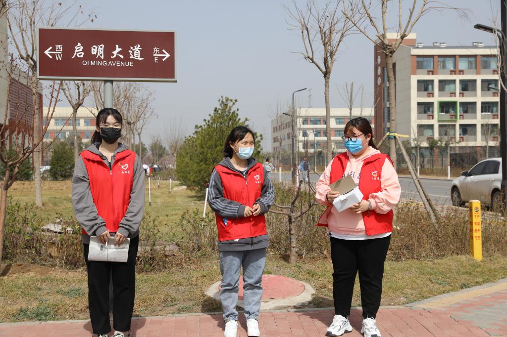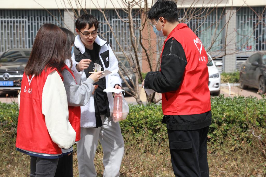 学生志愿者对在校的学生免费发放口罩并提醒疫情防控的重要性,务必公共场所佩戴口罩。